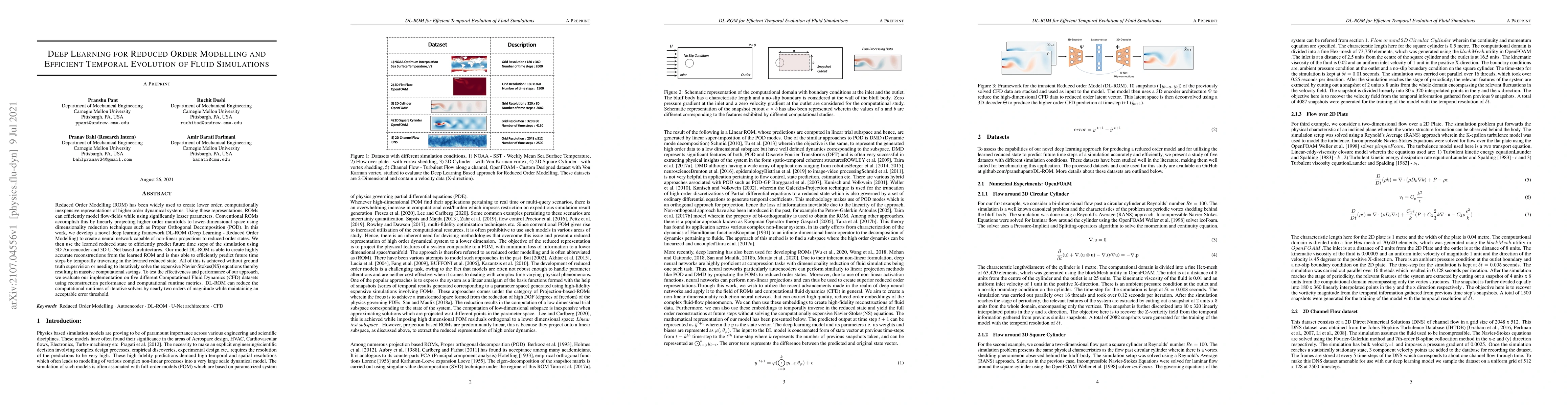 This research introduces DL-ROM, a deep learning framework for non-linear reduced order modeling of fluid simulations. DL-ROM uses 3D Autoencoder and 3D U-Net architectures to efficiently predict future time steps, reducing computational runtimes by nearly two orders of magnitude compared to traditional methods, without requiring ground truth or iterative NS equation solving.