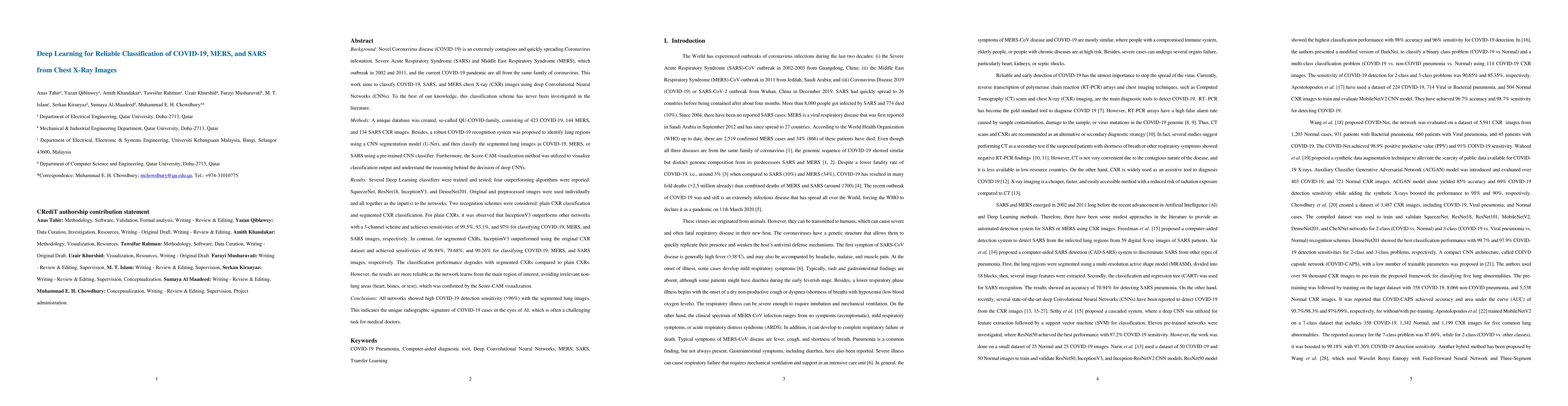 This research paper explores the use of deep learning techniques, specifically Convolutional Neural Networks (CNNs), to classify chest X-ray images of COVID-19, MERS, and SARS. The study introduces a new database, QU-COVID-family, and proposes a robust system for identifying and classifying lung regions in X-rays using a CNN segmentation model (U-Net) followed by a pre-trained CNN classifier. The paper reports on the performance of several deep learning classifiers, highlighting the effectiveness of the InceptionV3 model in achieving high sensitivities for classifying these diseases. The results suggest that segmented lung images provide better COVID-19 detection sensitivity compared to plain chest X-rays.