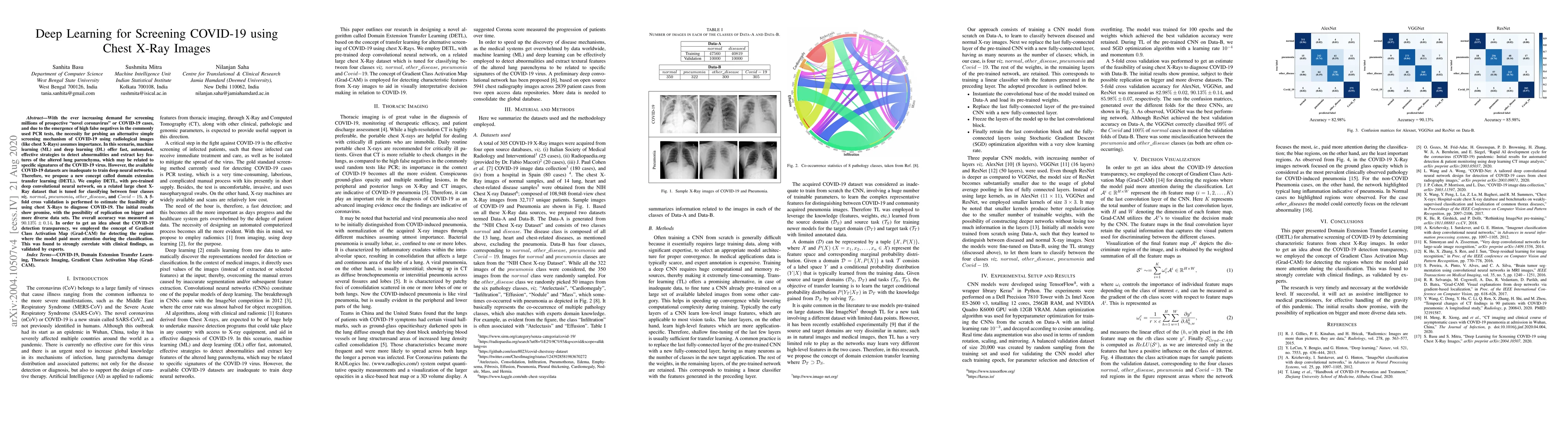 This paper explores the use of deep learning and domain extension transfer learning to screen for COVID-19 using chest X-ray images, achieving an accuracy of 90.13%. The study employs Grad-CAM for transparency and correlation with clinical findings.