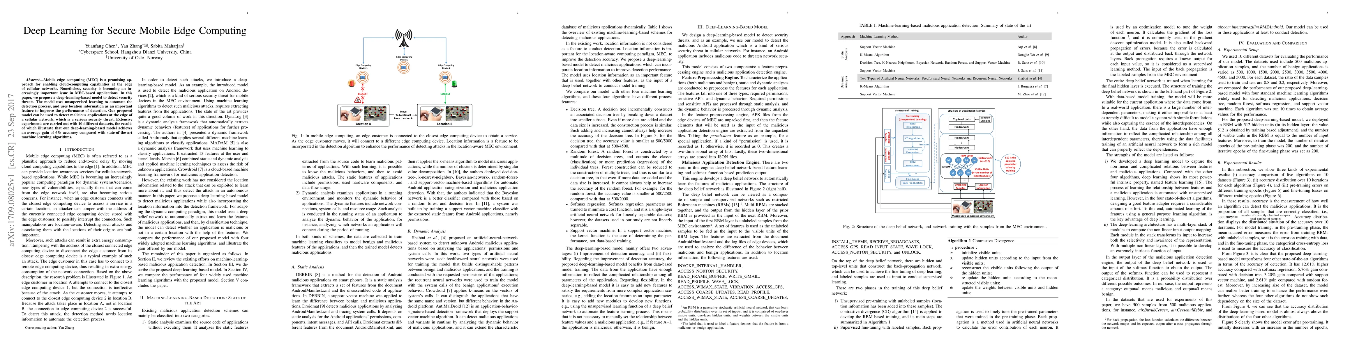 Mobile edge computing (MEC) is a promising approach for enabling cloud-computing capabilities at the edge of cellular networks. Nonetheless, security is becoming an increasingly important issue in MEC-based applications. In this paper, we propose a deep-learning-based model to detect security threats. The model uses unsupervised learning to automate the detection process, and uses location information as an important feature to improve the performance of detection. Our proposed model can be used to detect malicious applications at the edge of a cellular network, which is a serious security threat. Extensive experiments are carried out with 10 different datasets, the results of which illustrate that our deep-learning-based model achieves an average gain of 6% accuracy compared with state-of-the-art machine learning algorithms.