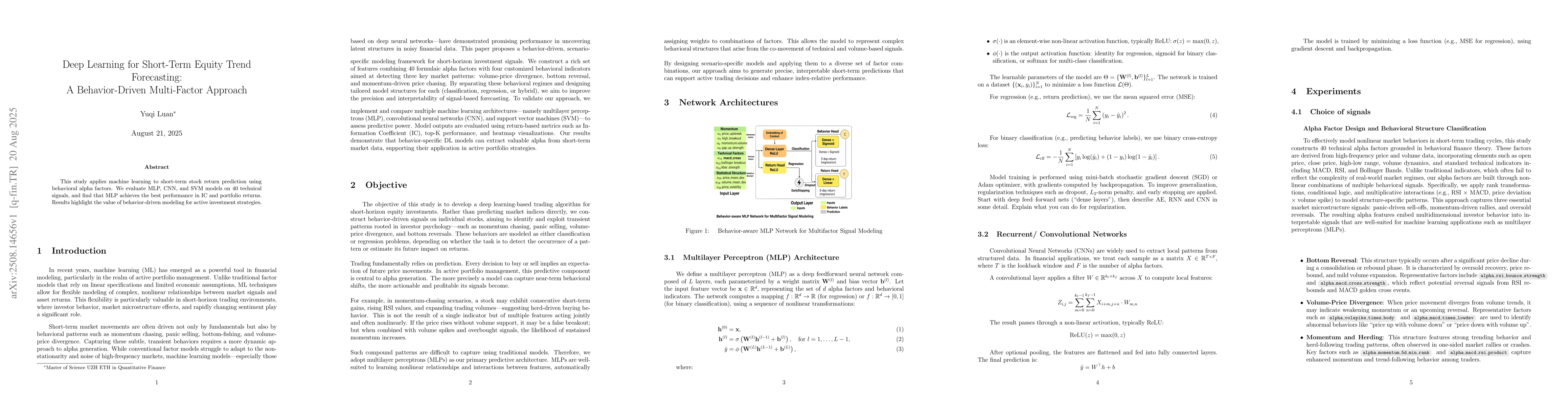 This work stands out by integrating behavioral finance insights with deep learning for short-term equity trend forecasting, outperforming traditional linear and shallow machine learning approaches in capturing nonlinear relationships and complex factor interactions.