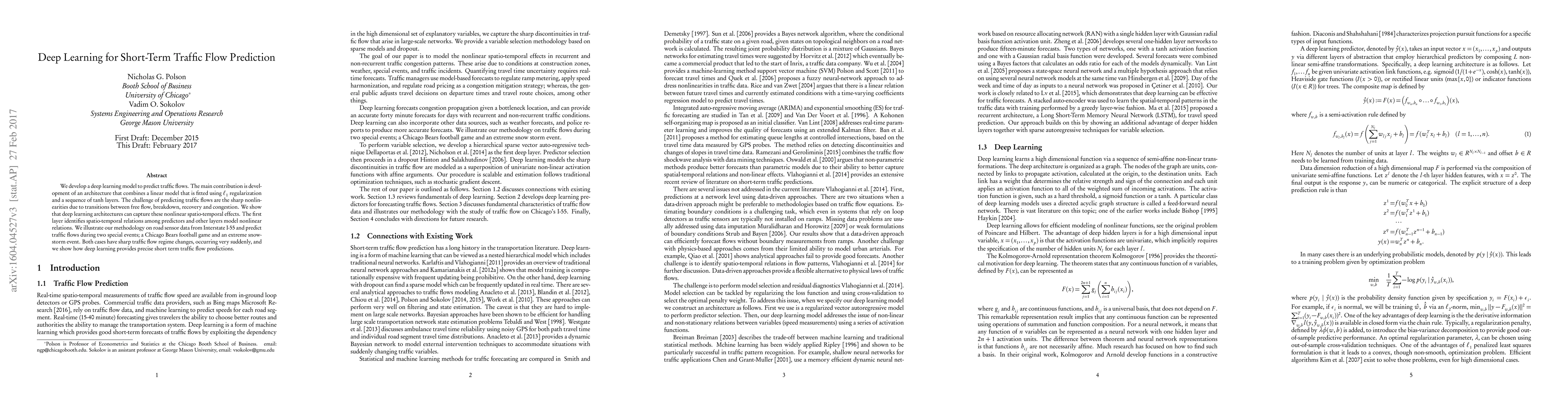 We develop a deep learning model to predict traffic flows. The main contribution is development of an architecture that combines a linear model that is fitted using $\ell_1$ regularization and a sequence of $\tanh$ layers. The challenge of predicting traffic flows are the sharp nonlinearities due to transitions between free flow, breakdown, recovery and congestion. We show that deep learning architectures can capture these nonlinear spatio-temporal effects. The first layer identifies spatio-temporal relations among predictors and other layers model nonlinear relations. We illustrate our methodology on road sensor data from Interstate I-55 and predict traffic flows during two special events; a Chicago Bears football game and an extreme snowstorm event. Both cases have sharp traffic flow regime changes, occurring very suddenly, and we show how deep learning provides precise short term traffic flow predictions.