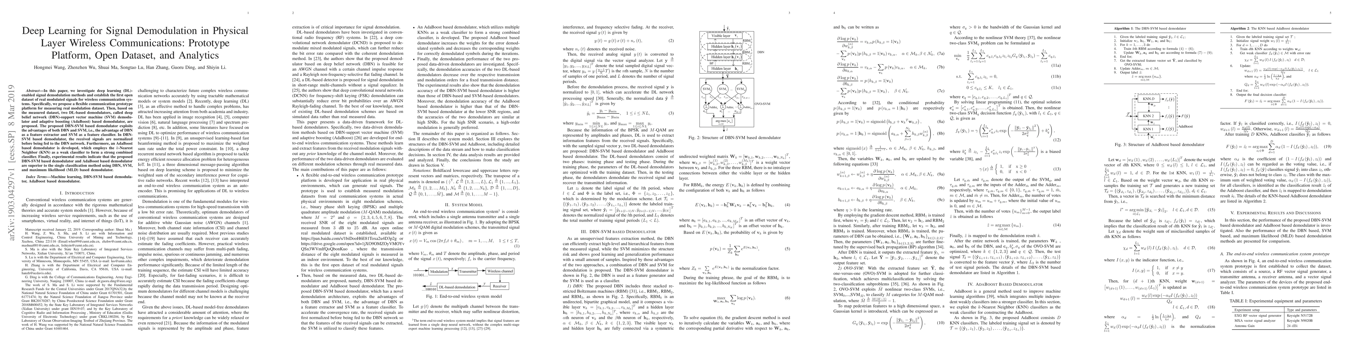In this paper, we investigate deep learning (DL)-enabled signal demodulation methods and establish the first open dataset of real modulated signals for wireless communication systems. Specifically, we propose a flexible communication prototype platform for measuring real modulation dataset. Then, based on the measured dataset, two DL-based demodulators, called deep belief network (DBN)-support vector machine (SVM) demodulator and adaptive boosting (AdaBoost) based demodulator, are proposed. The proposed DBN-SVM based demodulator exploits the advantages of both DBN and SVM, i.e., the advantage of DBN as a feature extractor and SVM as a feature classifier. In DBN-SVM based demodulator, the received signals are normalized before being fed to the DBN network. Furthermore, an AdaBoost based demodulator is developed, which employs the $k$-Nearest Neighbor (KNN) as a weak classifier to form a strong combined classifier. Finally, experimental results indicate that the proposed DBN-SVM based demodulator and AdaBoost based demodulator are superior to the single classification method using DBN, SVM, and maximum likelihood (MLD) based demodulator.