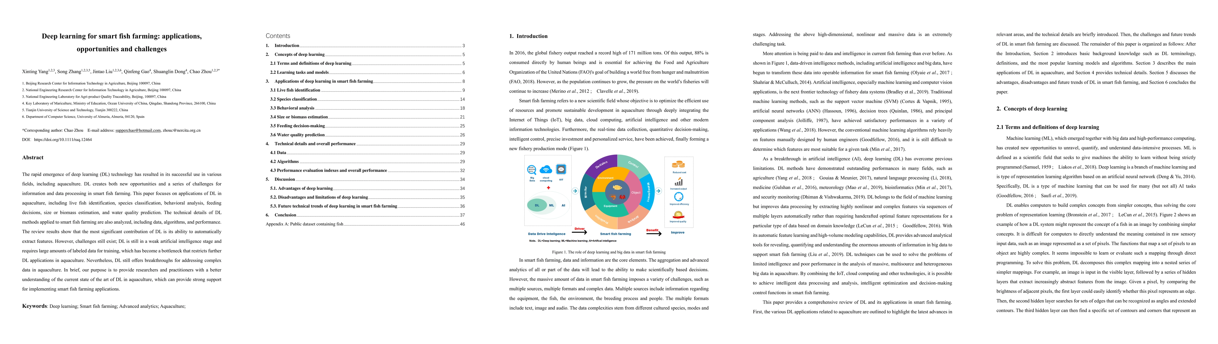 This paper reviews deep learning applications in smart fish farming, highlighting uses like live fish identification and water quality prediction. While deep learning provides significant advancements in automating feature extraction, challenges remain, particularly the need for extensive labeled data and the current limitations of weak artificial intelligence.