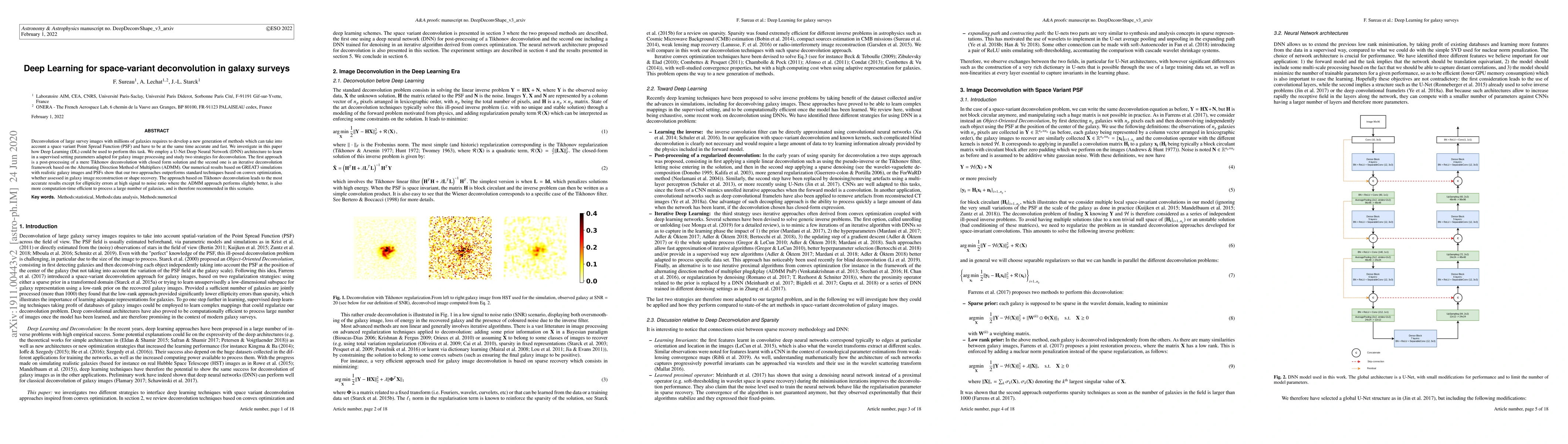 This paper explores deep learning for space-variant deconvolution in galaxy surveys using a U-Net DNN, comparing two strategies: post-processing Tikhonov deconvolution and iterative ADMM. Results from GREAT3 simulations show both DL approaches outperform standard techniques, with the ADMM method being more efficient and slightly better at high SNR.