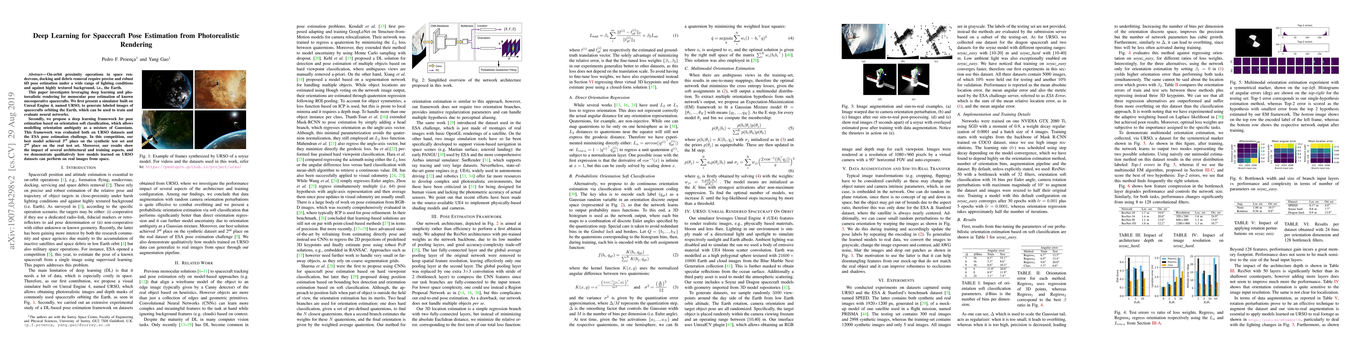 This paper explores deep learning for spacecraft pose estimation using photorealistic rendering and a simulator named URSO built on Unreal Engine 4. It proposes a deep learning framework for 6D pose estimation that models orientation ambiguity, achieving top results in the ESA pose estimation challenge.