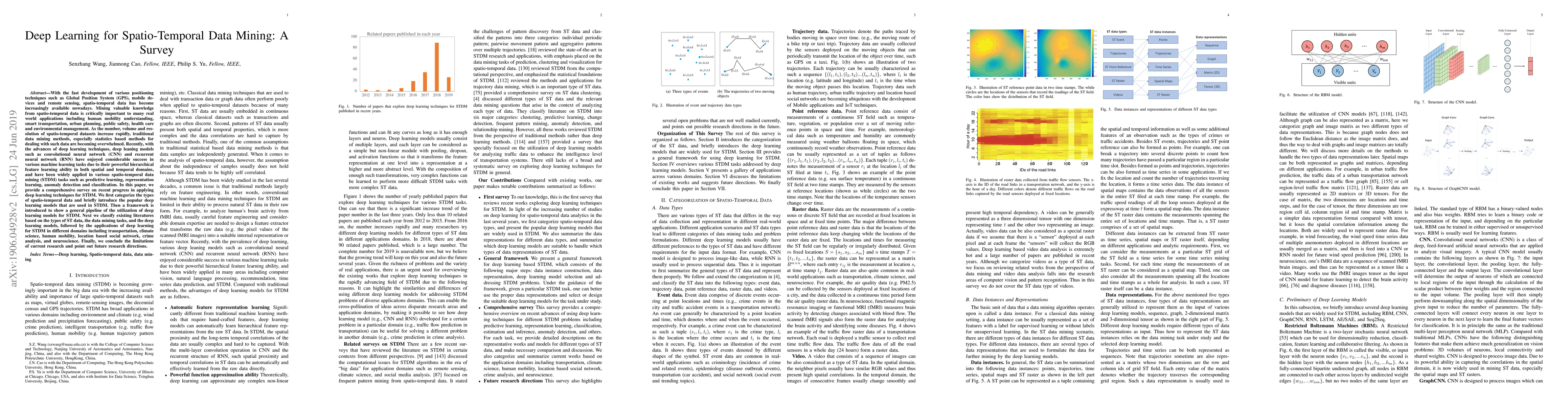This paper surveys recent advancements in deep learning applications for mining spatio-temporal data, highlighting the use of models like CNNs and RNNs for tasks such as predictive learning and anomaly detection. It categorizes existing literature based on data types, tasks, and models, and discusses applications across various domains including transportation and neuroscience.