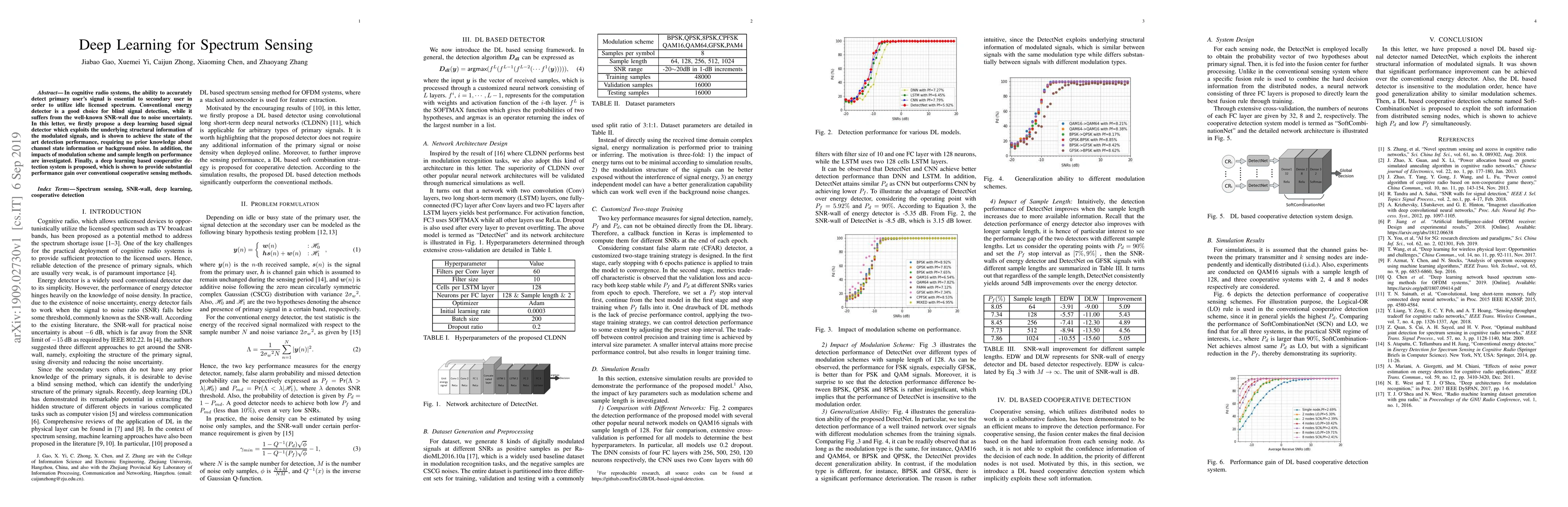 This paper proposes a deep learning-based signal detector for cognitive radio systems, achieving superior detection performance without requiring prior knowledge of channel conditions. It also investigates the effects of modulation schemes and sample lengths, and introduces a cooperative detection system that outperforms traditional methods.