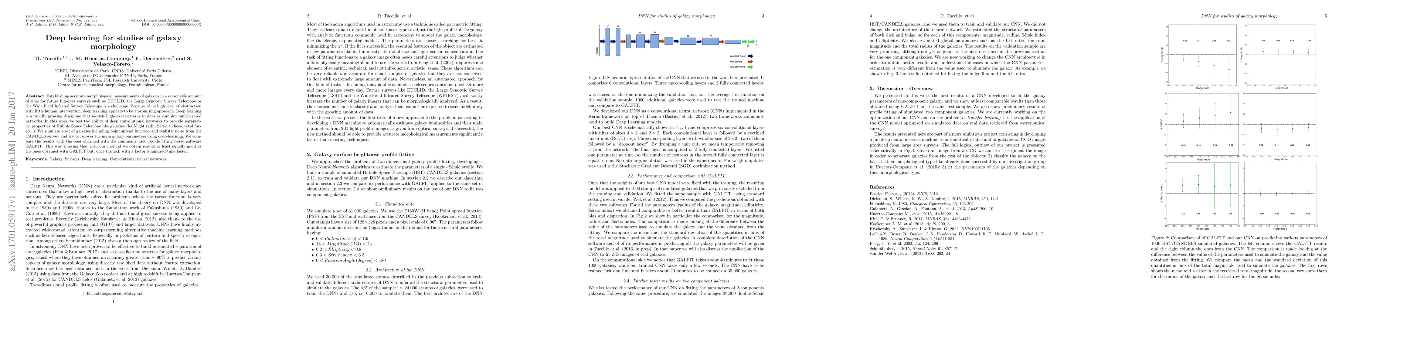 Establishing accurate morphological measurements of galaxies in a reasonable amount of time for future big-data surveys such as EUCLID, the Large Synoptic Survey Telescope or the Wide Field Infrared Survey Telescope is a challenge. Because of its high level of abstraction with little human intervention, deep learning appears to be a promising approach. Deep learning is a rapidly growing discipline that models high-level patterns in data as complex multilayered networks. In this work we test the ability of deep convolutional networks to provide parametric properties of Hubble Space Telescope like galaxies (half-light radii, Sersic indices, total flux etc..). We simulate a set of galaxies including point spread function and realistic noise from the CANDELS survey and try to recover the main galaxy parameters using deep-learning. We com- pare the results with the ones obtained with the commonly used profile fitting based software GALFIT. This way showing that with our method we obtain results at least equally good as the ones obtained with GALFIT but, once trained, with a factor 5 hundred time faster.