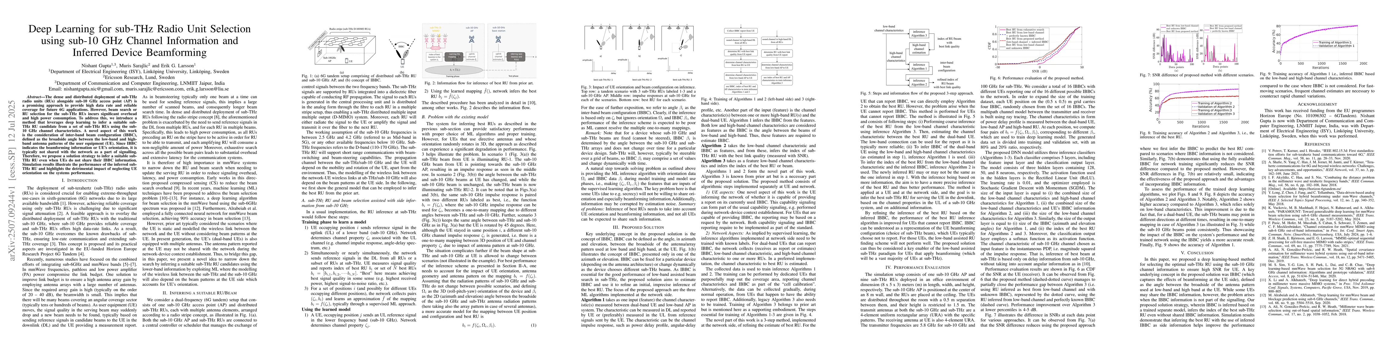The dense and distributed deployment of sub-THz radio units (RUs) alongside sub-10 GHz access point (AP) is a promising approach to provide high data rate and reliable coverage for future 6G applications. However, beam search or RU selection for the sub-THz RUs incurs significant overhead and high power consumption. To address this, we introduce a method that leverages deep learning to infer a suitable sub-THz RU candidate from a set of sub-THz RUs using the sub-10 GHz channel characteristics. A novel aspect of this work is the consideration of inter-band beam configuration (IBBC), defined as the broadside angle between the low-band and high-band antenna patterns of the user equipment (UE). Since IBBC indicates the beamforming information or UE's orientation, it is typically not shared with the network as a part of signalling. Therefore, we propose a solution strategy to infer a suitable sub-THz RU even when UEs do not share their IBBC information. Simulation results illustrate the performance of the inferred sub-THz RU and highlights the detrimental impact of neglecting UE orientation on the systems performance.