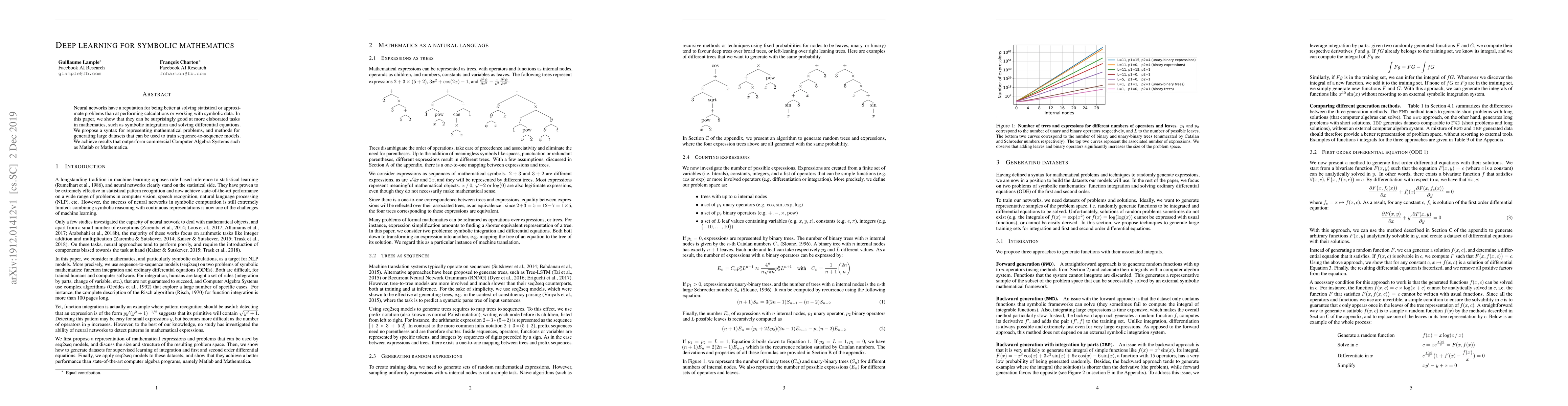 Researchers demonstrate that deep learning models can excel in mathematical tasks like symbolic integration and differential equations, outperforming commercial Computer Algebra Systems.
