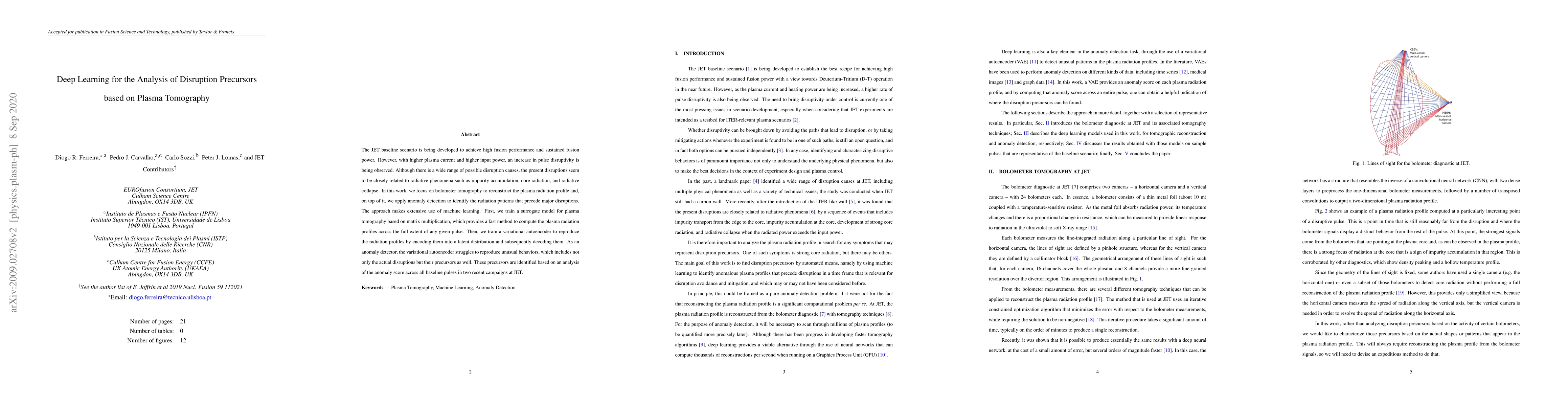 This paper develops deep learning techniques for identifying disruption precursors in plasma tomography data from JET experiments. It uses machine learning to reconstruct plasma radiation profiles and employs a variational autoencoder to detect anomalies, successfully identifying radiation patterns that precede major disruptions.
