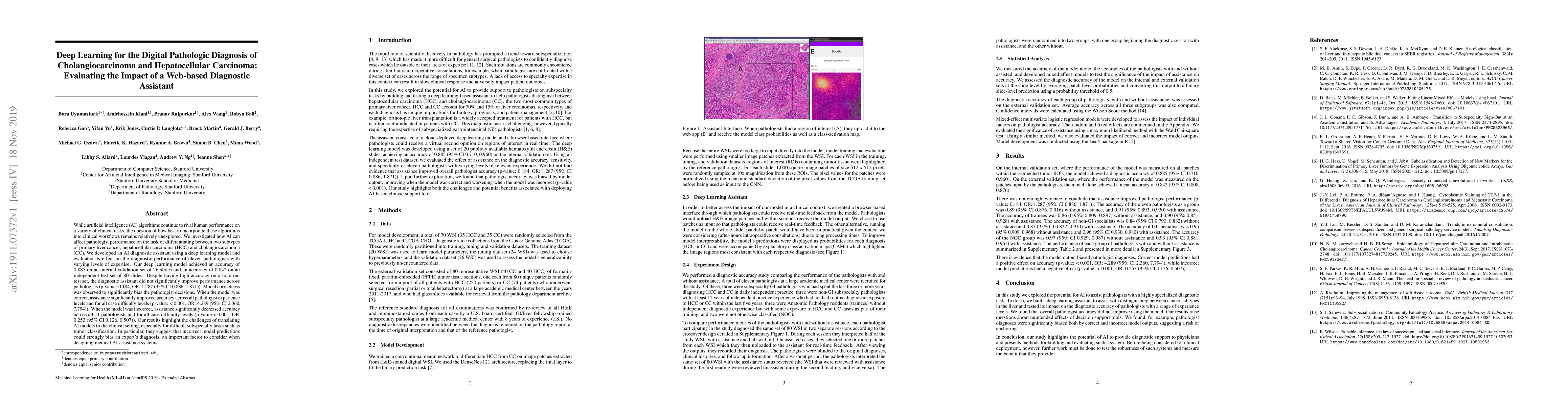 This study evaluates a deep learning diagnostic assistant for differentiating between cholangiocarcinoma and hepatocellular carcinoma, finding high model accuracy but no significant overall improvement in pathologist performance. However, correct model predictions significantly boosted accuracy, while incorrect predictions led to a marked decrease in accuracy, underscoring the risks of model bias in clinical settings.