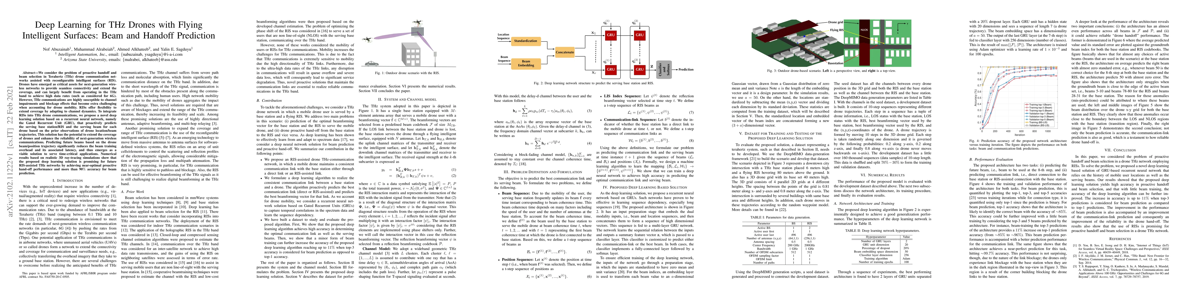 A deep learning solution using a recurrent neural network predicts drone beam trajectories to enhance THz drone communication coverage and reliability, achieving near-optimal proactive handoff performance and over 90% accuracy for beam prediction.