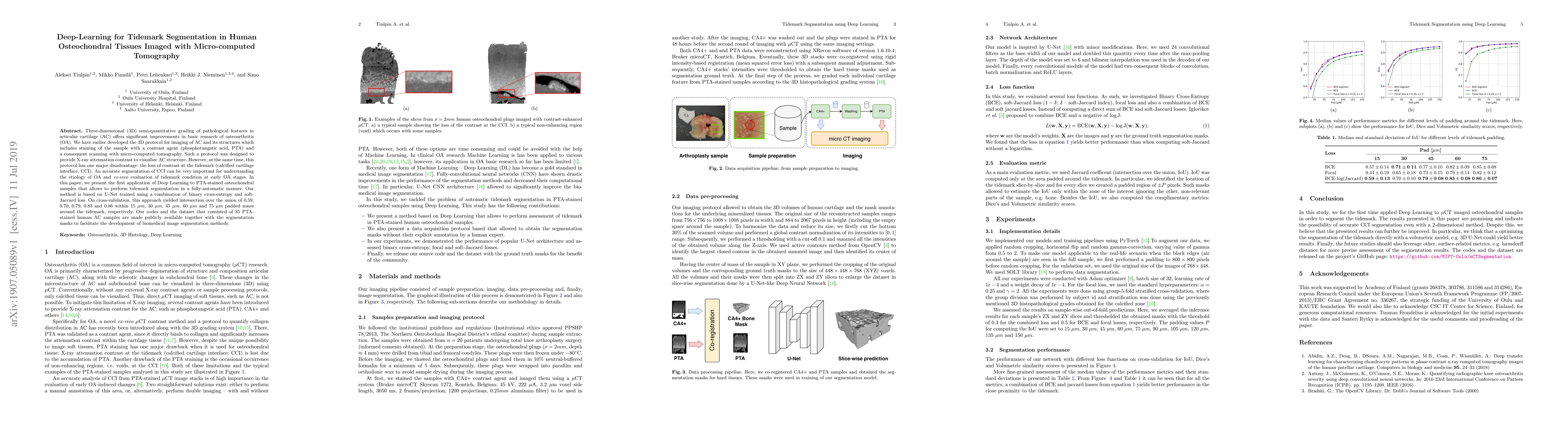 Three-dimensional (3D) semi-quantitative grading of pathological features in articular cartilage (AC) offers significant improvements in basic research of osteoarthritis (OA). We have earlier developed the 3D protocol for imaging of AC and its structures which includes staining of the sample with a contrast agent (phosphotungstic acid, PTA) and a consequent scanning with micro-computed tomography. Such a protocol was designed to provide X-ray attenuation contrast to visualize AC structure. However, at the same time, this protocol has one major disadvantage: the loss of contrast at the tidemark (calcified cartilage interface, CCI). An accurate segmentation of CCI can be very important for understanding the etiology of OA and ex-vivo evaluation of tidemark condition at early OA stages. In this paper, we present the first application of Deep Learning to PTA-stained osteochondral samples that allows to perform tidemark segmentation in a fully-automatic manner. Our method is based on U-Net trained using a combination of binary cross-entropy and soft Jaccard loss. On cross-validation, this approach yielded intersection over the union of 0.59, 0.70, 0.79, 0.83 and 0.86 within 15 {\mu}m, 30 {\mu}m, 45 {\mu}m, 60 {\mu}m and 75 {\mu}m padded zones around the tidemark, respectively. Our codes and the dataset that consisted of 35 PTA-stained human AC samples are made publicly available together with the segmentation masks to facilitate the development of biomedical image segmentation methods.