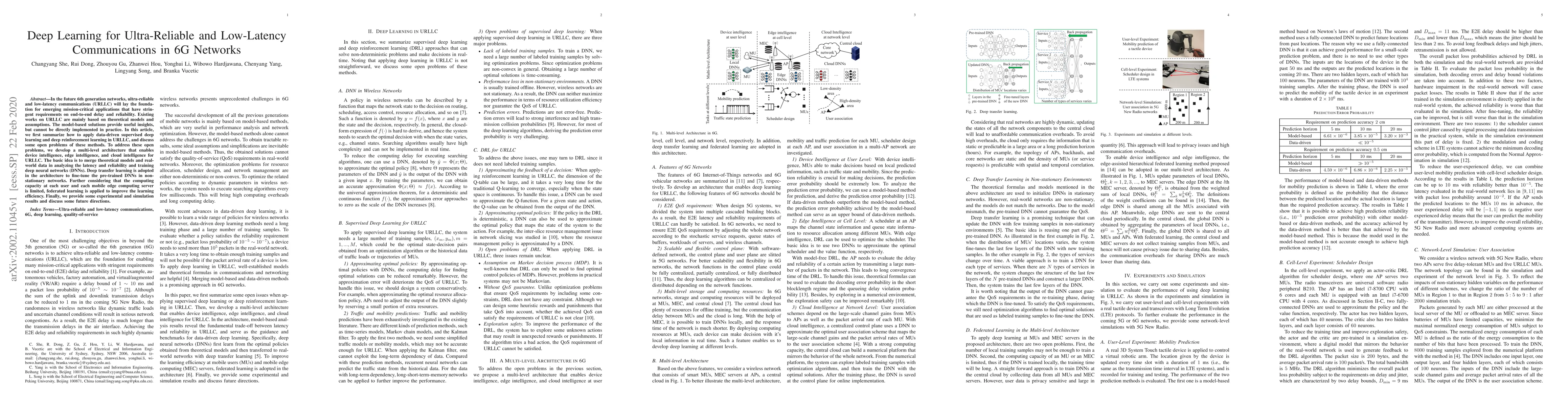 This paper explores the application of deep learning techniques, including supervised learning and deep reinforcement learning, to achieve ultra-reliable and low-latency communications in 6G networks. It proposes a multi-level architecture integrating device, edge, and cloud intelligence, employing deep transfer learning and federated learning to enhance network performance and address practical implementation challenges.