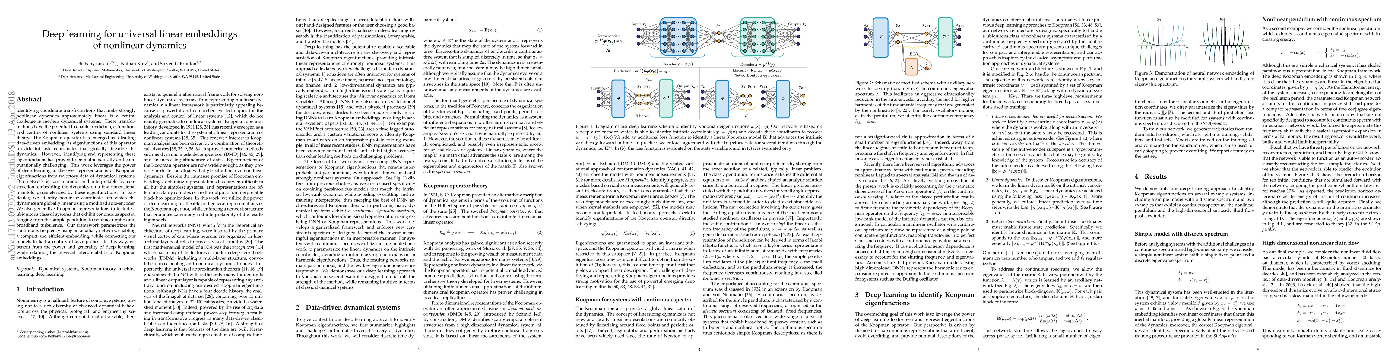 This paper uses deep learning to identify linear embeddings of nonlinear dynamical systems via Koopman operator eigenfunctions, enabling prediction and control. It employs a modified auto-encoder for discovering intrinsic coordinates and generalizes the approach to systems with continuous spectra, maintaining interpretability.