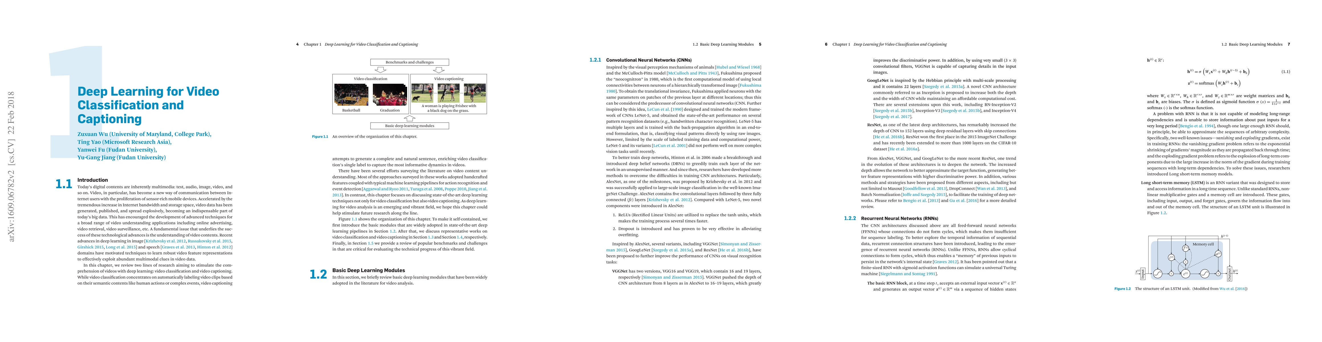 This paper reviews deep learning techniques for video classification and captioning, focusing on automatically labeling video clips and generating descriptive sentences to capture video dynamics. It also surveys key benchmarks and competitions that drive progress in this field.