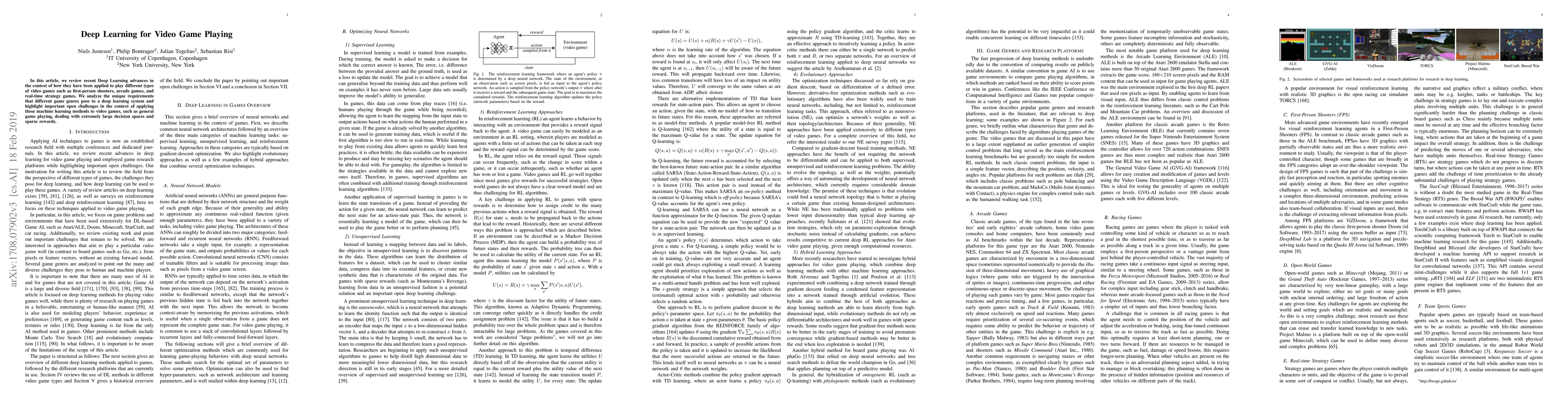 The paper reviews recent deep learning advances in video game playing, analyzing how these methods are applied to various game genres like first-person shooters, arcade games, and real-time strategy games. It highlights unique requirements of different game genres and discusses open challenges such as general game playing, large decision spaces, and sparse rewards.