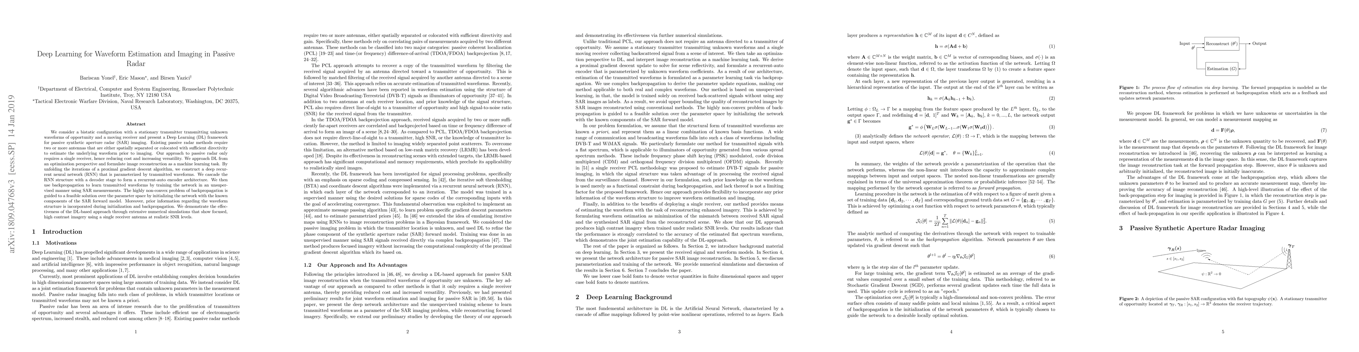 We consider a bistatic configuration with a stationary transmitter transmitting unknown waveforms of opportunity and a moving receiver, and present a Deep Learning (DL) framework for passive synthetic aperture radar (SAR) imaging. Existing passive radar methods require two or more antennas which are either spatially separated or colocated with sufficient directivity to estimate the underlying waveform prior to imaging. Our approach to passive radar only requires a single receiver, hence reduces cost and increases versatility. We approach DL from an optimization perspective and formulate image reconstruction as a machine learning task. By unfolding the iterations of a proximal gradient descent algorithm, we construct a deep recurrent neural network (RNN) that is parameterized by transmitted waveforms. We cascade the RNN structure with a decoder stage to form a recurrent-auto encoder architecture. We then utilize backpropagation to learn transmitted waveforms by training the network in an unsupervised manner using SAR measurements. The highly non-convex problem of backpropagation is guided to a feasible solution over the parameter space by initializing the network with the known components of the SAR forward model. Moreover, prior information regarding the waveform structure is incorporated during initialization and backpropagation. We demonstrate the effectiveness of the DL-based approach through extensive numerical simulations that show focused, high contrast imagery using a single receiver antenna at realistic SNR levels.