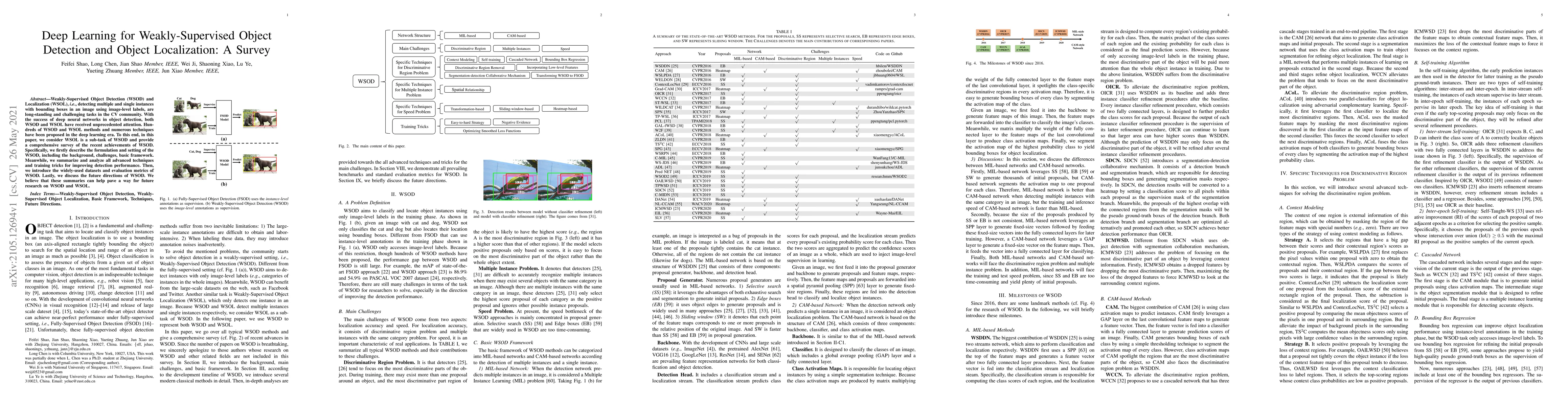 Weakly-Supervised Object Detection (WSOD) and Localization (WSOL), i.e., detecting multiple and single instances with bounding boxes in an image using image-level labels, are long-standing and challenging tasks in the CV community. With the success of deep neural networks in object detection, both WSOD and WSOL have received unprecedented attention. Hundreds of WSOD and WSOL methods and numerous techniques have been proposed in the deep learning era. To this end, in this paper, we consider WSOL is a sub-task of WSOD and provide a comprehensive survey of the recent achievements of WSOD. Specifically, we firstly describe the formulation and setting of the WSOD, including the background, challenges, basic framework. Meanwhile, we summarize and analyze all advanced techniques and training tricks for improving detection performance. Then, we introduce the widely-used datasets and evaluation metrics of WSOD. Lastly, we discuss the future directions of WSOD. We believe that these summaries can help pave a way for future research on WSOD and WSOL.