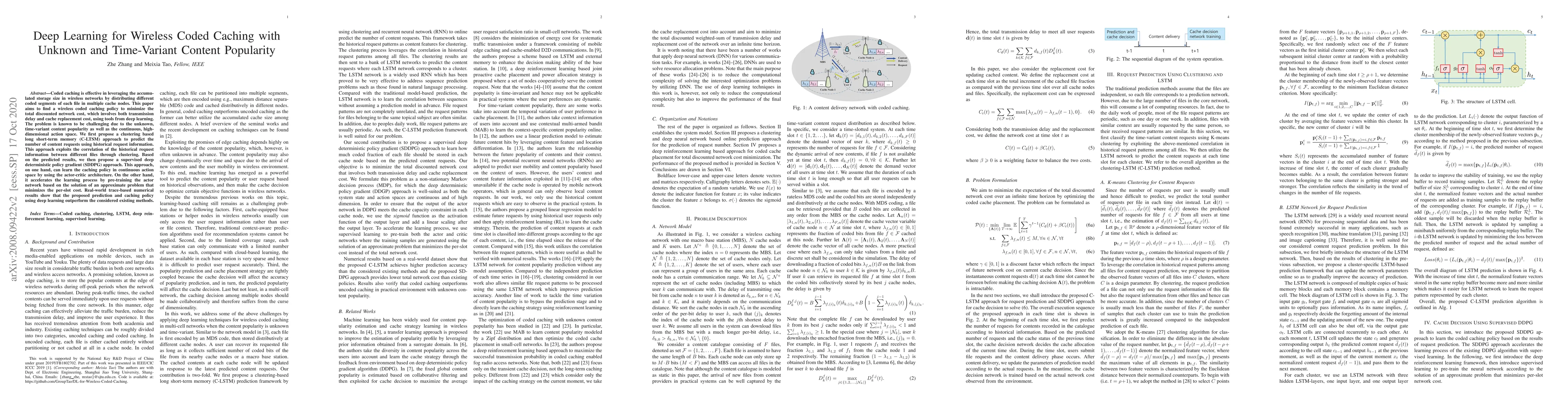 This paper proposes a deep learning approach to optimize wireless coded caching in networks with unknown and time-variant content popularity. It uses a clustering-based long short-term memory (C-LTSM) model to predict content requests and a supervised deep deterministic policy gradient (SDDPG) to learn caching policies, achieving better performance than existing methods.