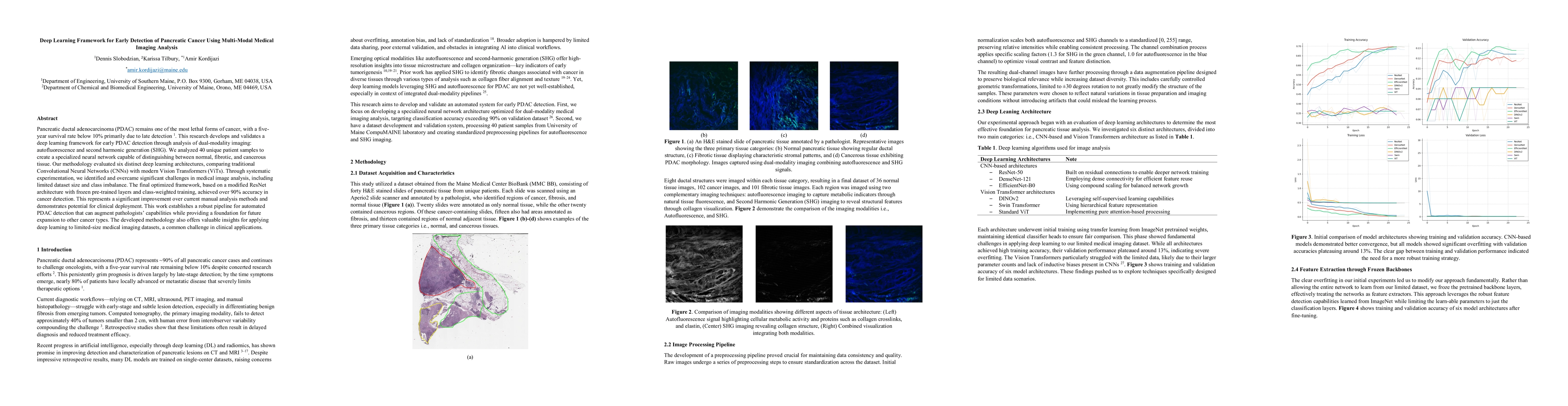 Pacreatic ductal adenocarcinoma (PDAC) remains one of the most lethal forms of cancer, with a five-year survival rate below 10% primarily due to late detection. This research develops and validates a deep learning framework for early PDAC detection through analysis of dual-modality imaging: autofluorescence and second harmonic generation (SHG). We analyzed 40 unique patient samples to create a specialized neural network capable of distinguishing between normal, fibrotic, and cancerous tissue. Our methodology evaluated six distinct deep learning architectures, comparing traditional Convolutional Neural Networks (CNNs) with modern Vision Transformers (ViTs). Through systematic experimentation, we identified and overcome significant challenges in medical image analysis, including limited dataset size and class imbalance. The final optimized framework, based on a modified ResNet architecture with frozen pre-trained layers and class-weighted training, achieved over 90% accuracy in cancer detection. This represents a significant improvement over current manual analysis methods an demonstrates potential for clinical deployment. This work establishes a robust pipeline for automated PDAC detection that can augment pathologists' capabilities while providing a foundation for future expansion to other cancer types. The developed methodology also offers valuable insights for applying deep learning to limited-size medical imaging datasets, a common challenge in clinical applications.