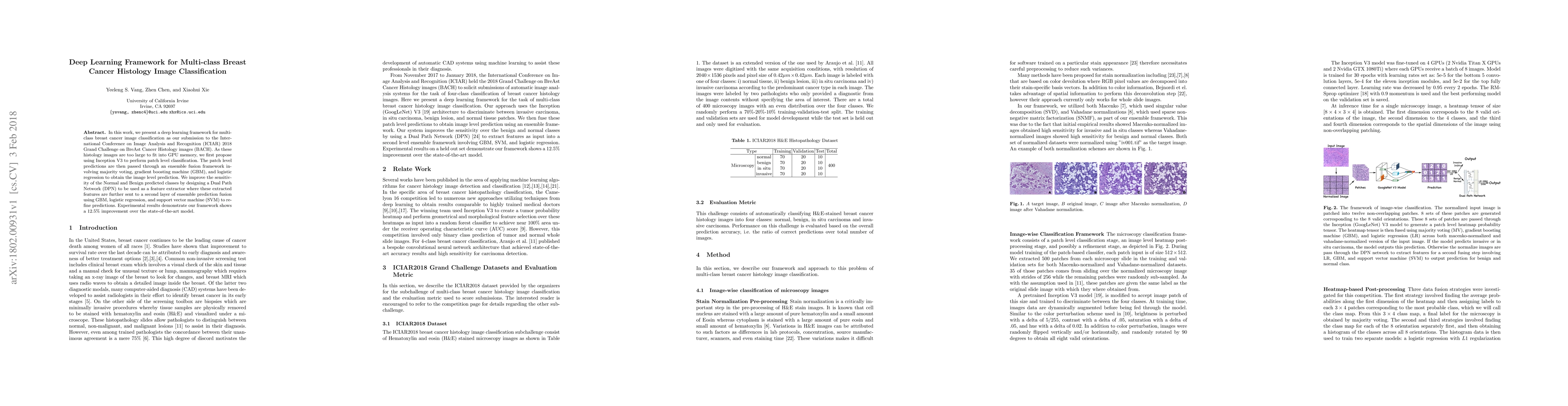 This paper introduces a deep learning framework for multi-class breast cancer histology image classification, employing Inception V3 for patch-level analysis and an ensemble fusion method for image-level predictions. The framework shows a 12.5% improvement over existing models, particularly enhancing the sensitivity of Normal and Benign classes using a Dual Path Network.