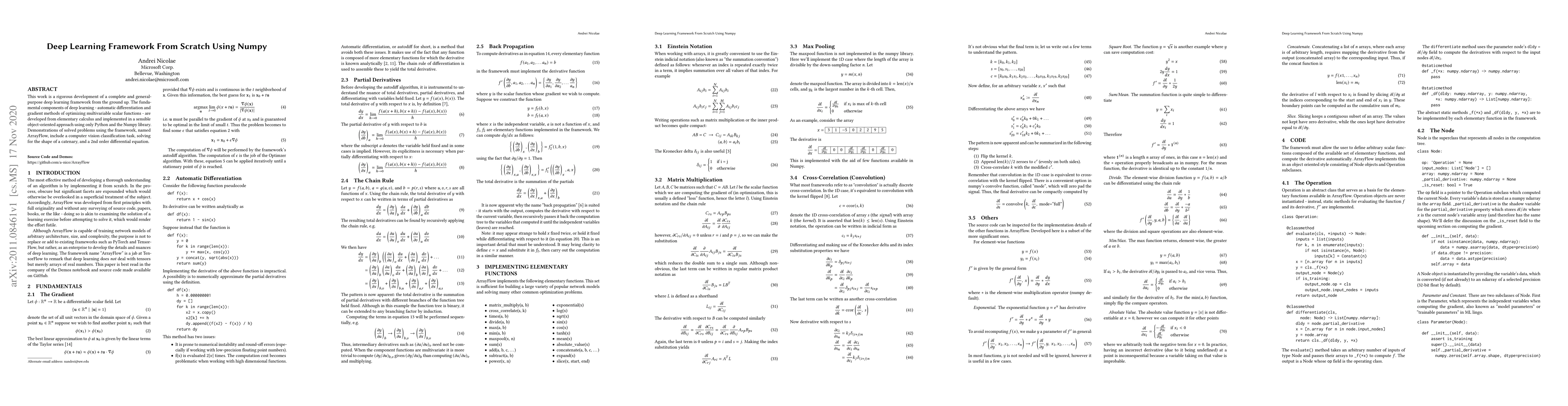 This paper develops a deep learning framework, ArrayFlow, from scratch using only Python and Numpy, focusing on automatic differentiation and gradient optimization methods. It demonstrates the framework's capabilities through tasks like computer vision classification, catenary shape determination, and solving a 2nd order differential equation.