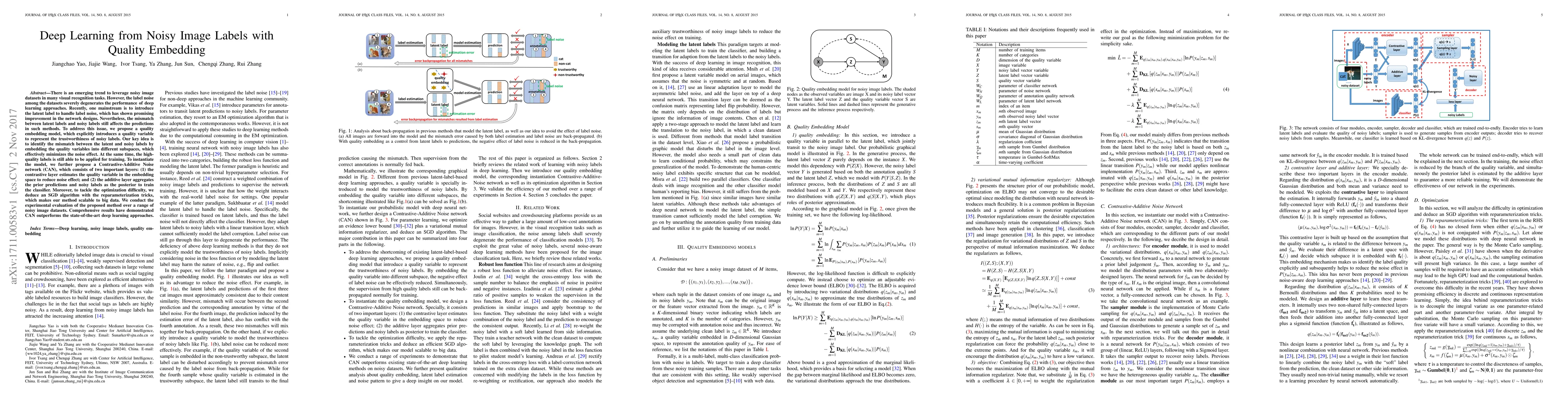 This paper proposes a quality embedding model to handle label noise in deep learning for visual recognition tasks, introducing a Contrastive-Additive Noise network (CAN) that separates latent and noisy labels using quality variables. The CAN method effectively minimizes noise effects and outperforms state-of-the-art approaches in experiments on noisy image datasets.