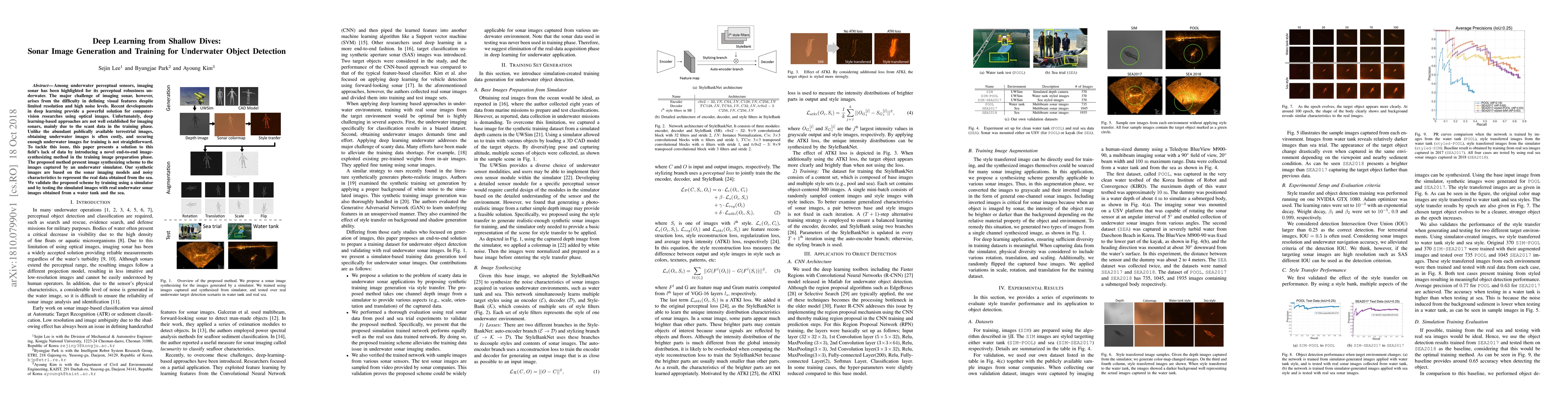 Among underwater perceptual sensors, imaging sonar has been highlighted for its perceptual robustness underwater. The major challenge of imaging sonar, however, arises from the difficulty in defining visual features despite limited resolution and high noise levels. Recent developments in deep learning provide a powerful solution for computer-vision researches using optical images. Unfortunately, deep learning-based approaches are not well established for imaging sonars, mainly due to the scant data in the training phase. Unlike the abundant publically available terrestrial images, obtaining underwater images is often costly, and securing enough underwater images for training is not straightforward. To tackle this issue, this paper presents a solution to this field's lack of data by introducing a novel end-to-end image-synthesizing method in the training image preparation phase. The proposed method present image synthesizing scheme to the images captured by an underwater simulator. Our synthetic images are based on the sonar imaging models and noisy characteristics to represent the real data obtained from the sea. We validate the proposed scheme by training using a simulator and by testing the simulated images with real underwater sonar images obtained from a water tank and the sea.