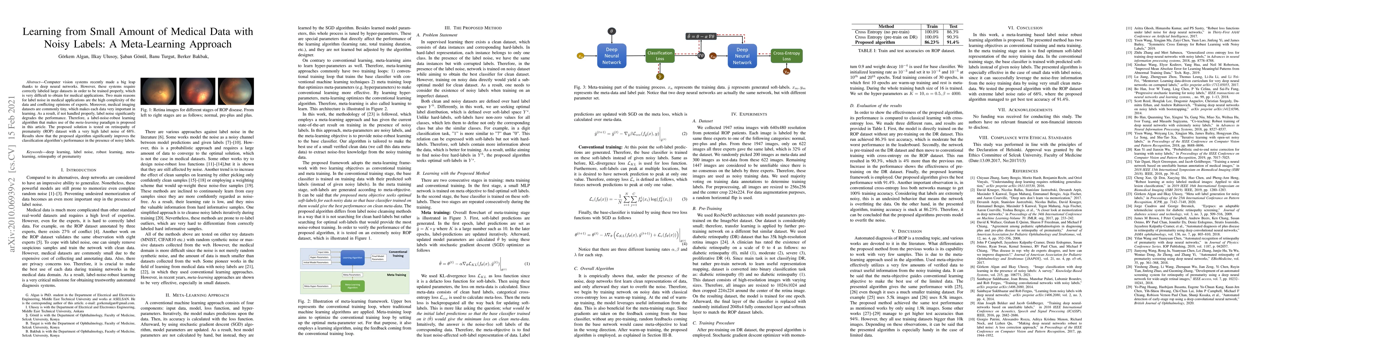 Computer vision systems recently made a big leap thanks to deep neural networks. However, these systems require correctly labeled large datasets in order to be trained properly, which is very difficult to obtain for medical applications. Two main reasons for label noise in medical applications are the high complexity of the data and conflicting opinions of experts. Moreover, medical imaging datasets are commonly tiny, which makes each data very important in learning. As a result, if not handled properly, label noise significantly degrades the performance. Therefore, a label-noise-robust learning algorithm that makes use of the meta-learning paradigm is proposed in this article. The proposed solution is tested on retinopathy of prematurity (ROP) dataset with a very high label noise of 68%. Results show that the proposed algorithm significantly improves the classification algorithm's performance in the presence of noisy labels.