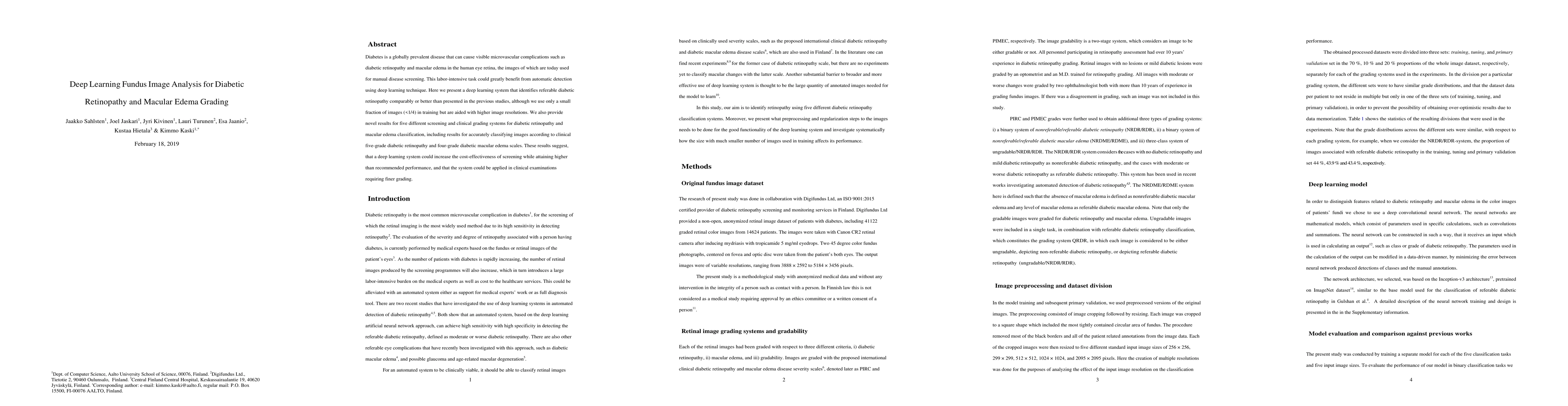 Diabetes is a globally prevalent disease that can cause visible microvascular complications such as diabetic retinopathy and macular edema in the human eye retina, the images of which are today used for manual disease screening. This labor-intensive task could greatly benefit from automatic detection using deep learning technique. Here we present a deep learning system that identifies referable diabetic retinopathy comparably or better than presented in the previous studies, although we use only a small fraction of images (<1/4) in training but are aided with higher image resolutions. We also provide novel results for five different screening and clinical grading systems for diabetic retinopathy and macular edema classification, including results for accurately classifying images according to clinical five-grade diabetic retinopathy and four-grade diabetic macular edema scales. These results suggest, that a deep learning system could increase the cost-effectiveness of screening while attaining higher than recommended performance, and that the system could be applied in clinical examinations requiring finer grading.
