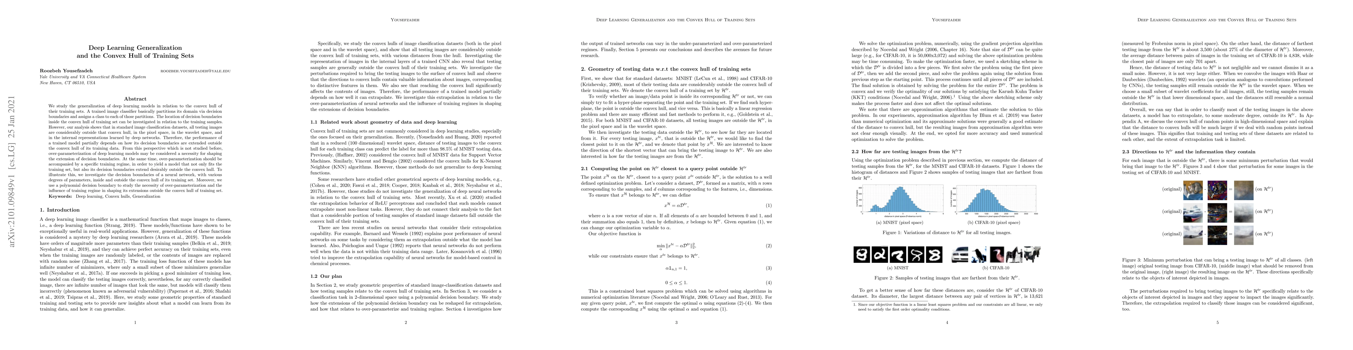 This paper investigates how the generalization of deep learning models relates to the convex hull of their training sets, finding that test images often lie outside this convex hull. The study highlights the necessity of over-parameterization in extending decision boundaries beyond the training data's convex hull, emphasizing the role of specific training regimes in achieving desirable performance.