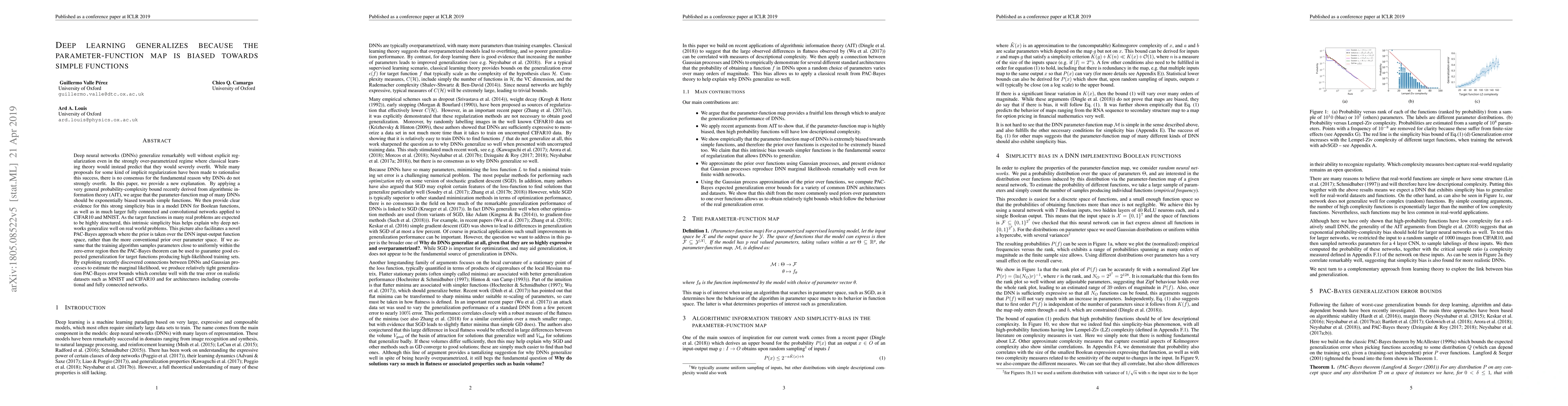 Deep neural networks (DNNs) generalize remarkably well without explicit regularization even in the strongly over-parametrized regime where classical learning theory would instead predict that they would severely overfit. While many proposals for some kind of implicit regularization have been made to rationalise this success, there is no consensus for the fundamental reason why DNNs do not strongly overfit. In this paper, we provide a new explanation. By applying a very general probability-complexity bound recently derived from algorithmic information theory (AIT), we argue that the parameter-function map of many DNNs should be exponentially biased towards simple functions. We then provide clear evidence for this strong simplicity bias in a model DNN for Boolean functions, as well as in much larger fully connected and convolutional networks applied to CIFAR10 and MNIST. As the target functions in many real problems are expected to be highly structured, this intrinsic simplicity bias helps explain why deep networks generalize well on real world problems. This picture also facilitates a novel PAC-Bayes approach where the prior is taken over the DNN input-output function space, rather than the more conventional prior over parameter space. If we assume that the training algorithm samples parameters close to uniformly within the zero-error region then the PAC-Bayes theorem can be used to guarantee good expected generalization for target functions producing high-likelihood training sets. By exploiting recently discovered connections between DNNs and Gaussian processes to estimate the marginal likelihood, we produce relatively tight generalization PAC-Bayes error bounds which correlate well with the true error on realistic datasets such as MNIST and CIFAR10 and for architectures including convolutional and fully connected networks.