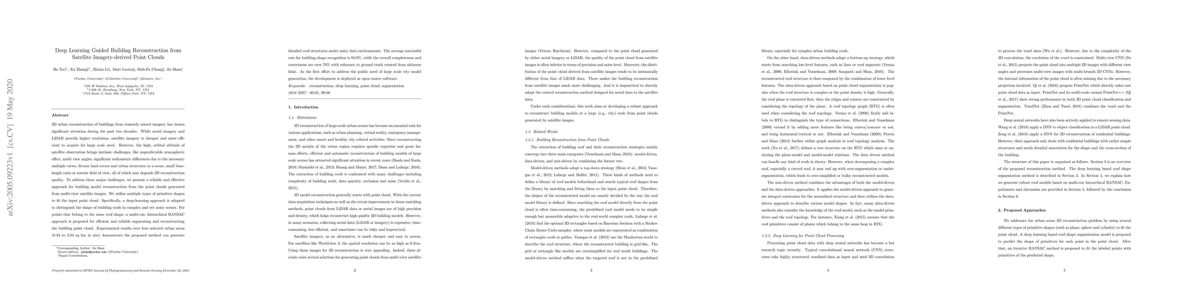 This paper presents a deep learning-guided method for reconstructing 3D building models from satellite imagery-derived point clouds, addressing challenges like atmospheric effects and multi-view angles. The approach uses deep learning for roof shape recognition and a hierarchical RANSAC method for segmenting and reconstructing building point clouds, achieving an 83% success rate for roof shape recognition and over 70% completeness and correctness compared to airborne LiDAR ground truth.