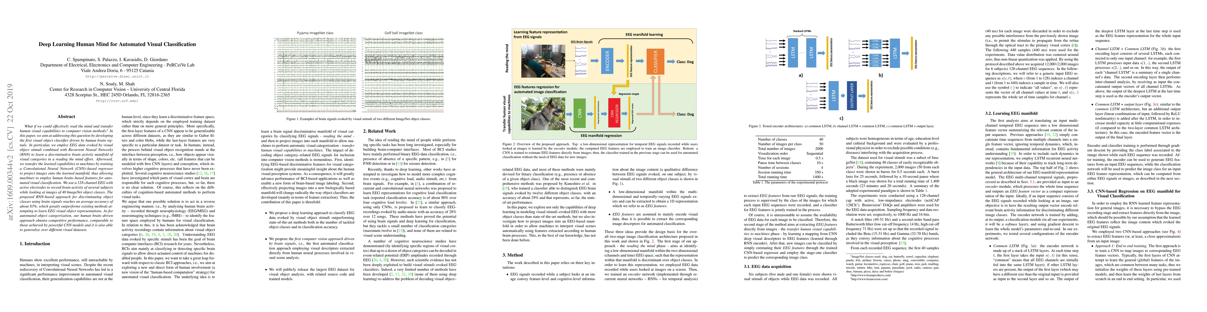 What if we could effectively read the mind and transfer human visual capabilities to computer vision methods? In this paper, we aim at addressing this question by developing the first visual object classifier driven by human brain signals. In particular, we employ EEG data evoked by visual object stimuli combined with Recurrent Neural Networks (RNN) to learn a discriminative brain activity manifold of visual categories. Afterwards, we train a Convolutional Neural Network (CNN)-based regressor to project images onto the learned manifold, thus effectively allowing machines to employ human brain-based features for automated visual classification. We use a 32-channel EEG to record brain activity of seven subjects while looking at images of 40 ImageNet object classes. The proposed RNN based approach for discriminating object classes using brain signals reaches an average accuracy of about 40%, which outperforms existing methods attempting to learn EEG visual object representations. As for automated object categorization, our human brain-driven approach obtains competitive performance, comparable to those achieved by powerful CNN models, both on ImageNet and CalTech 101, thus demonstrating its classification and generalization capabilities. This gives us a real hope that, indeed, human mind can be read and transferred to machines.