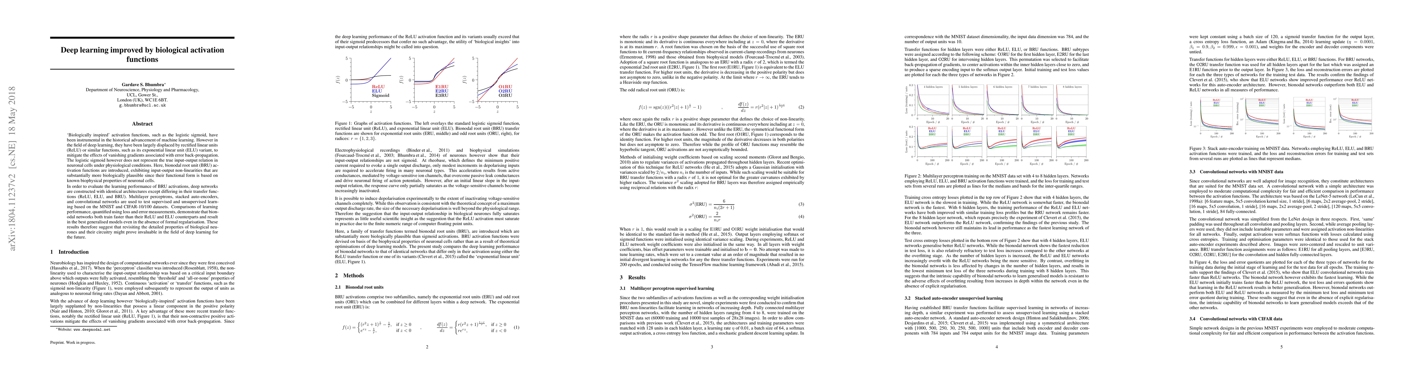 `Biologically inspired' activation functions, such as the logistic sigmoid, have been instrumental in the historical advancement of machine learning. However in the field of deep learning, they have been largely displaced by rectified linear units (ReLU) or similar functions, such as its exponential linear unit (ELU) variant, to mitigate the effects of vanishing gradients associated with error back-propagation. The logistic sigmoid however does not represent the true input-output relation in neuronal cells under physiological conditions. Here, bionodal root unit (BRU) activation functions are introduced, exhibiting input-output non-linearities that are substantially more biologically plausible since their functional form is based on known biophysical properties of neuronal cells. In order to evaluate the learning performance of BRU activations, deep networks are constructed with identical architectures except differing in their transfer functions (ReLU, ELU, and BRU). Multilayer perceptrons, stacked auto-encoders, and convolutional networks are used to test supervised and unsupervised learning based on the MNIST and CIFAR-10/100 datasets. Comparisons of learning performance, quantified using loss and error measurements, demonstrate that bionodal networks both train faster than their ReLU and ELU counterparts and result in the best generalised models even in the absence of formal regularisation. These results therefore suggest that revisiting the detailed properties of biological neurones and their circuitry might prove invaluable in the field of deep learning for the future.