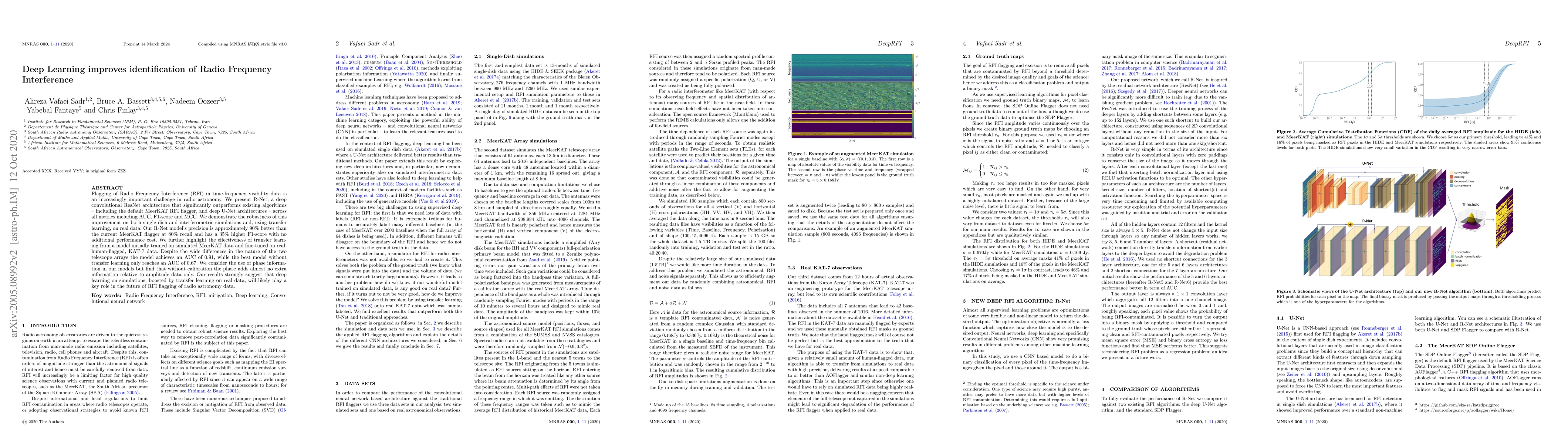 Deep learning model R-Net, based on a ResNet architecture, significantly enhances the identification of Radio Frequency Interference (RFI) in radio astronomy, outperforming existing algorithms and achieving a 90% improvement in precision at 80% recall. The model's effectiveness is further bolstered by transfer learning, demonstrating robust performance across different telescope data sets.