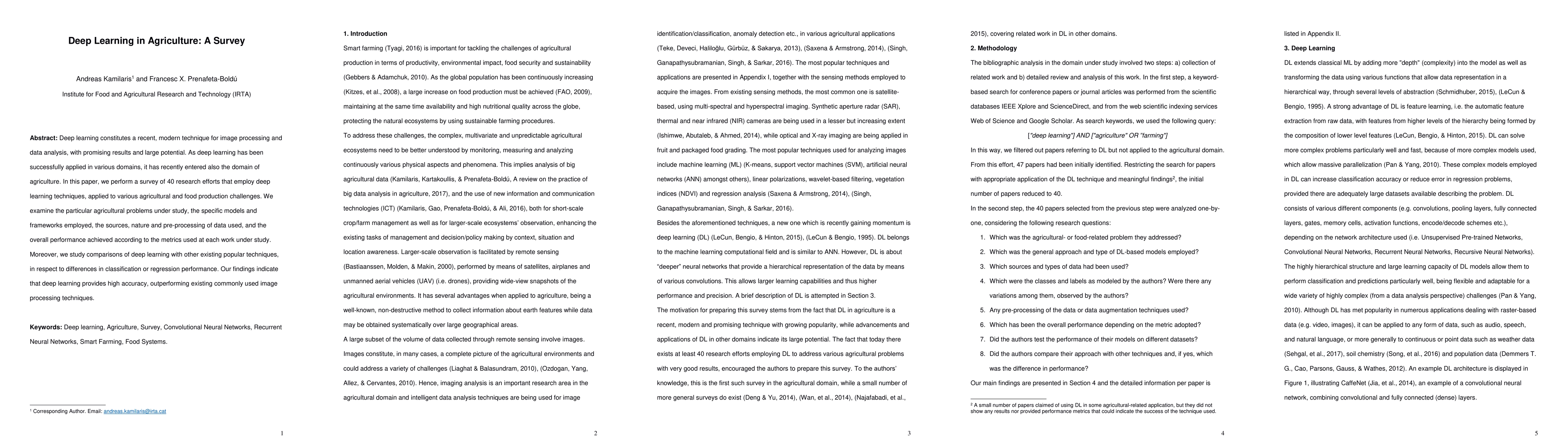 Deep learning constitutes a recent, modern technique for image processing and data analysis, with promising results and large potential. As deep learning has been successfully applied in various domains, it has recently entered also the domain of agriculture. In this paper, we perform a survey of 40 research efforts that employ deep learning techniques, applied to various agricultural and food production challenges. We examine the particular agricultural problems under study, the specific models and frameworks employed, the sources, nature and pre-processing of data used, and the overall performance achieved according to the metrics used at each work under study. Moreover, we study comparisons of deep learning with other existing popular techniques, in respect to differences in classification or regression performance. Our findings indicate that deep learning provides high accuracy, outperforming existing commonly used image processing techniques.