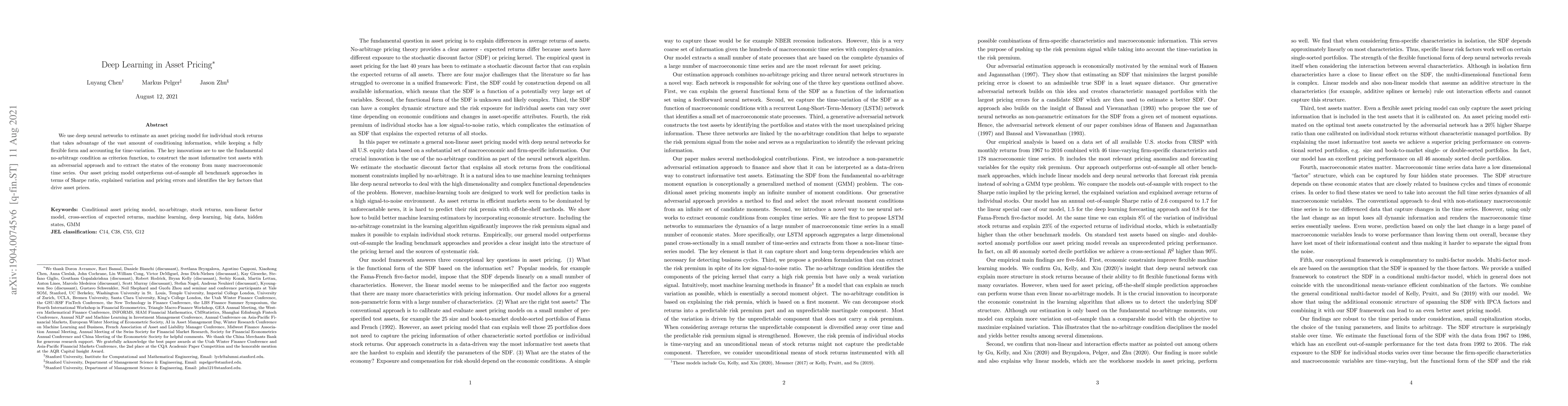 Summary: This paper utilizes deep neural networks to develop a flexible asset pricing model for individual stock returns, leveraging macroeconomic data and fundamental no-arbitrage conditions. The proposed model outperforms traditional benchmarks in predicting returns and identifying key economic drivers.