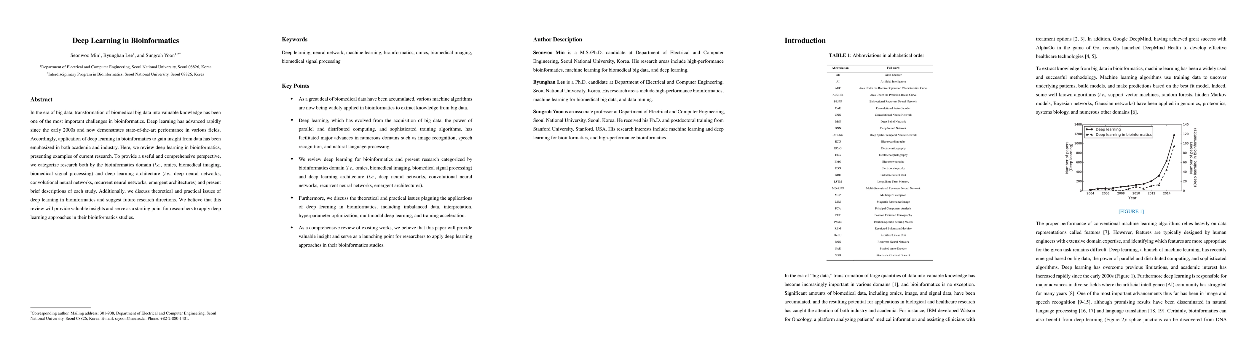 In the era of big data, transformation of biomedical big data into valuable knowledge has been one of the most important challenges in bioinformatics. Deep learning has advanced rapidly since the early 2000s and now demonstrates state-of-the-art performance in various fields. Accordingly, application of deep learning in bioinformatics to gain insight from data has been emphasized in both academia and industry. Here, we review deep learning in bioinformatics, presenting examples of current research. To provide a useful and comprehensive perspective, we categorize research both by the bioinformatics domain (i.e., omics, biomedical imaging, biomedical signal processing) and deep learning architecture (i.e., deep neural networks, convolutional neural networks, recurrent neural networks, emergent architectures) and present brief descriptions of each study. Additionally, we discuss theoretical and practical issues of deep learning in bioinformatics and suggest future research directions. We believe that this review will provide valuable insights and serve as a starting point for researchers to apply deep learning approaches in their bioinformatics studies.