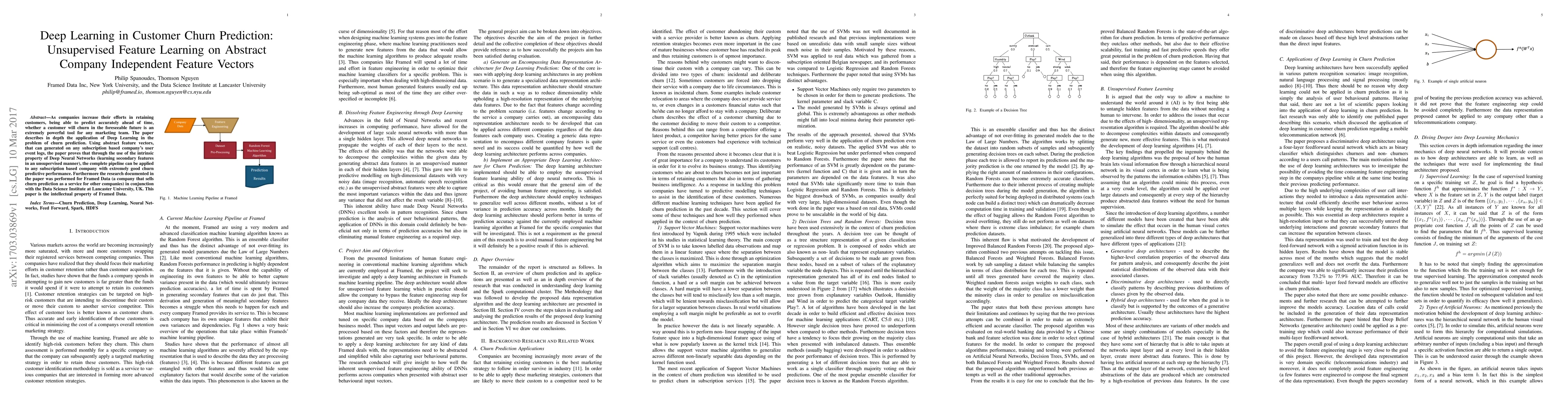 This paper explores the application of Deep Learning for predicting customer churn using unsupervised feature learning on abstract feature vectors derived from user event logs. The research demonstrates that Deep Neural Networks can effectively learn secondary features without supervision, enabling accurate churn prediction across any subscription-based company.