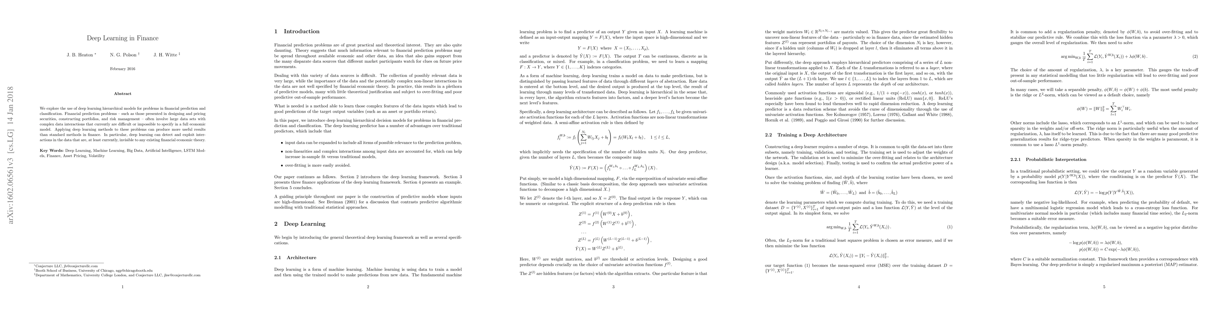 This paper investigates the application of deep learning hierarchical models for financial prediction and classification, demonstrating that deep learning can better handle complex data interactions in financial problems like securities pricing and portfolio construction compared to traditional methods. It highlights deep learning's ability to uncover hidden data interactions beyond current economic theories.