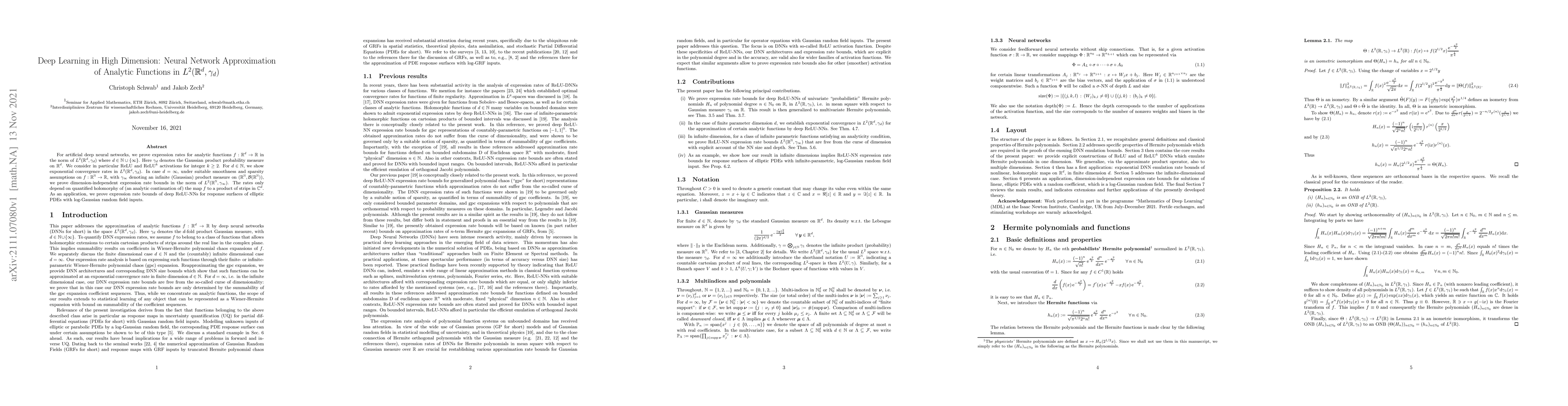 For artificial deep neural networks, we prove expression rates for analytic functions $f:\mathbb{R}^d\to\mathbb{R}$ in the norm of $L^2(\mathbb{R}^d,\gamma_d)$ where $d\in {\mathbb{N}}\cup\{ \infty \}$. Here $\gamma_d$ denotes the Gaussian product probability measure on $\mathbb{R}^d$. We consider in particular ReLU and ReLU${}^k$ activations for integer $k\geq 2$. For $d\in\mathbb{N}$, we show exponential convergence rates in $L^2(\mathbb{R}^d,\gamma_d)$. In case $d=\infty$, under suitable smoothness and sparsity assumptions on $f:\mathbb{R}^{\mathbb{N}}\to\mathbb{R}$, with $\gamma_\infty$ denoting an infinite (Gaussian) product measure on $\mathbb{R}^{\mathbb{N}}$, we prove dimension-independent expression rate bounds in the norm of $L^2(\mathbb{R}^{\mathbb{N}},\gamma_\infty)$. The rates only depend on quantified holomorphy of (an analytic continuation of) the map $f$ to a product of strips in $\mathbb{C}^d$. As an application, we prove expression rate bounds of deep ReLU-NNs for response surfaces of elliptic PDEs with log-Gaussian random field inputs.