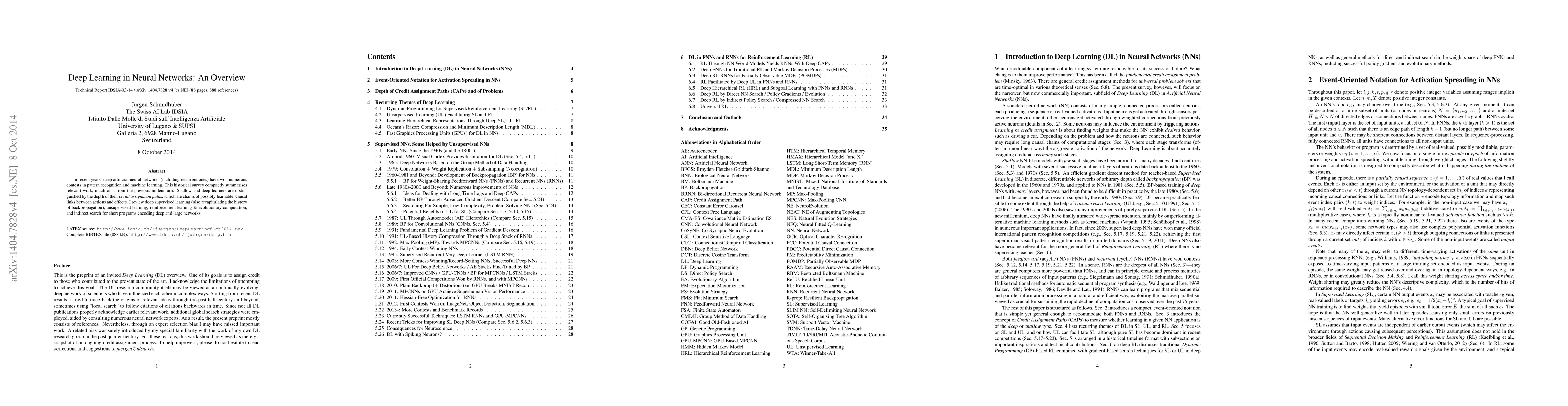 This paper provides a historical survey of deep learning in neural networks, distinguishing between shallow and deep learners based on the depth of their credit assignment paths. It reviews deep supervised learning, unsupervised learning, reinforcement learning, and evolutionary computation, along with methods for discovering short programs encoding deep networks.