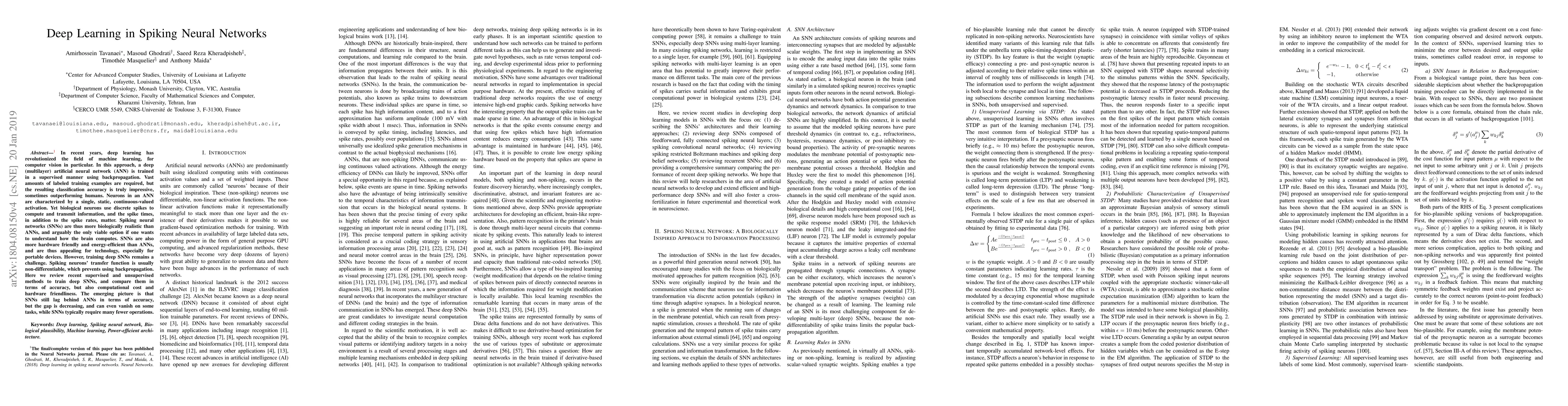 This paper reviews recent advancements in training deep spiking neural networks (SNNs) compared to traditional artificial neural networks (ANNs), highlighting their potential for hardware efficiency and biological realism. Despite SNNs still lagging in accuracy, they show promise in reducing computational costs and energy usage, with the gap in performance narrowing on certain tasks.