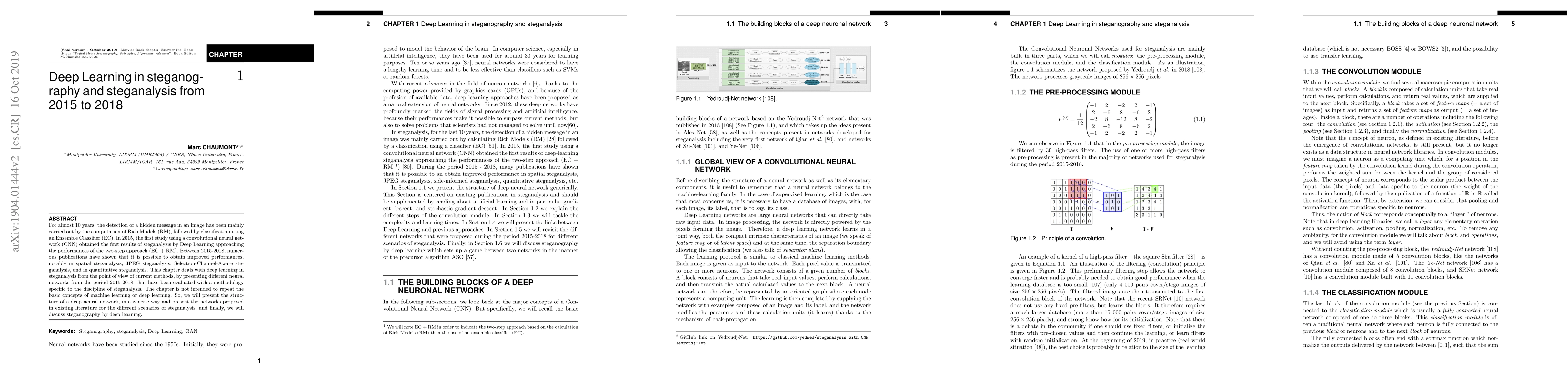For almost 10 years, the detection of a hidden message in an image has been mainly carried out by the computation of Rich Models (RM), followed by classification using an Ensemble Classifier (EC). In 2015, the first study using a convolutional neural network (CNN) obtained the first results of steganalysis by Deep Learning approaching the performances of the two-step approach (EC + RM). Between 2015-2018, numerous publications have shown that it is possible to obtain improved performances, notably in spatial steganalysis, JPEG steganalysis, Selection-Channel-Aware steganalysis, and in quantitative steganalysis. This chapter deals with deep learning in steganalysis from the point of view of current methods, by presenting different neural networks from the period 2015-2018, that have been evaluated with a methodology specific to the discipline of steganalysis. The chapter is not intended to repeat the basic concepts of machine learning or deep learning. So, we will present the structure of a deep neural network, in a generic way and present the networks proposed in existing literature for the different scenarios of steganalysis, and finally, we will discuss steganography by deep learning.