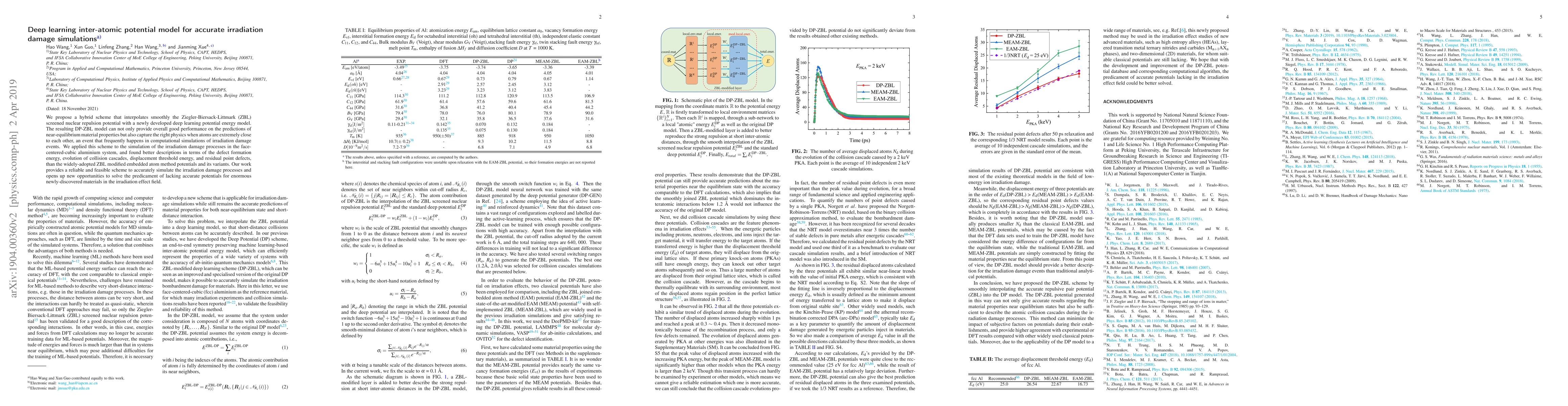 This paper introduces a hybrid deep learning inter-atomic potential model that combines the ZBL screened nuclear repulsion potential with a new deep learning potential energy model, achieving better accuracy in simulating irradiation damage in materials like face-centered-cubic aluminium. The proposed DP-ZBL model outperforms existing methods in predicting defect formation and cascade evolution.