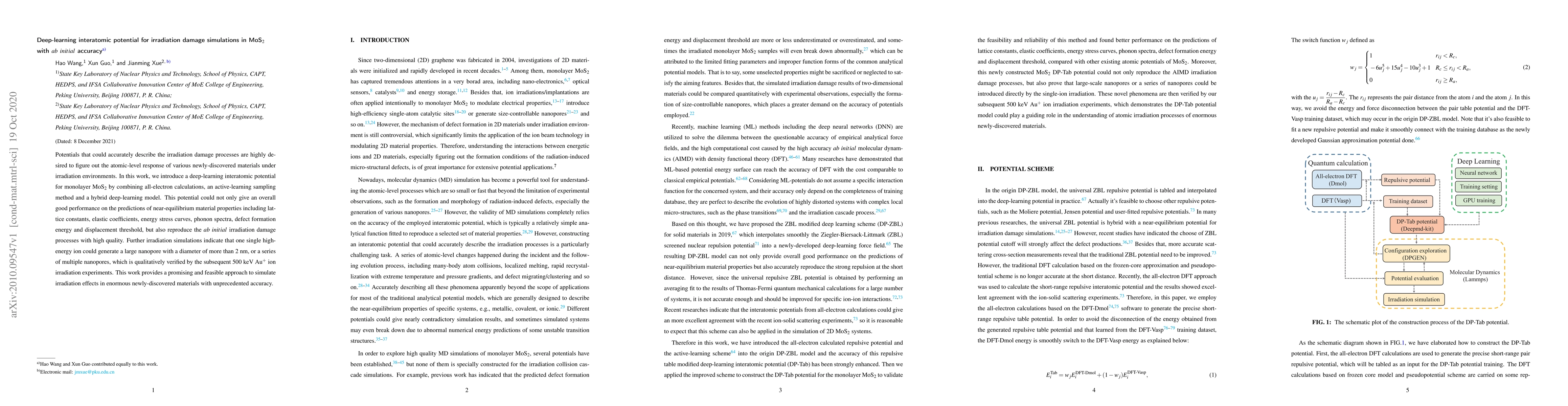 This paper introduces a deep-learning interatomic potential for monolayer MoS2 that accurately simulates irradiation damage processes, combining all-electron calculations, active-learning sampling, and a hybrid deep-learning model. The potential successfully predicts material properties and reproduces irradiation damage, verified by experimental results showing nanopore formation.